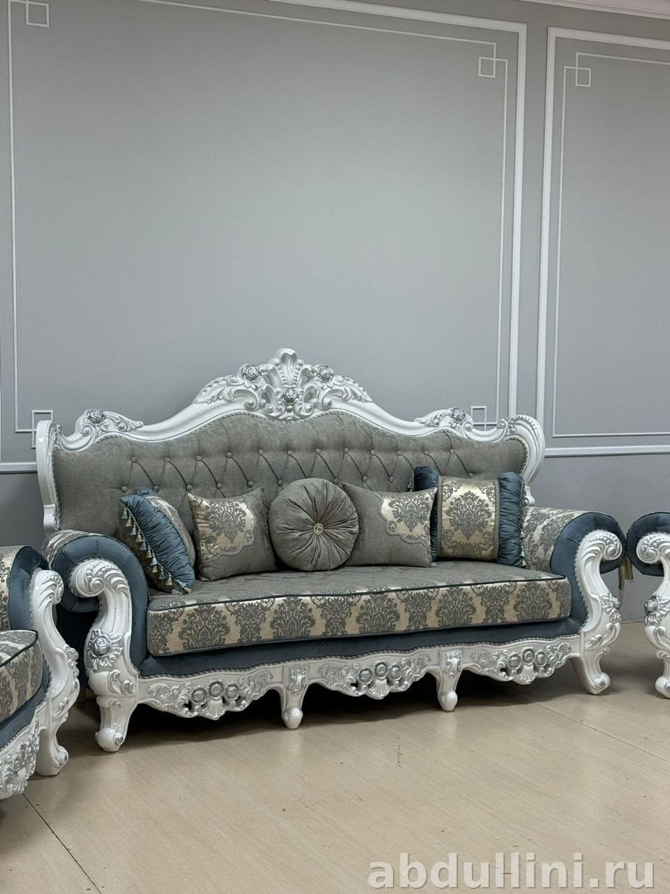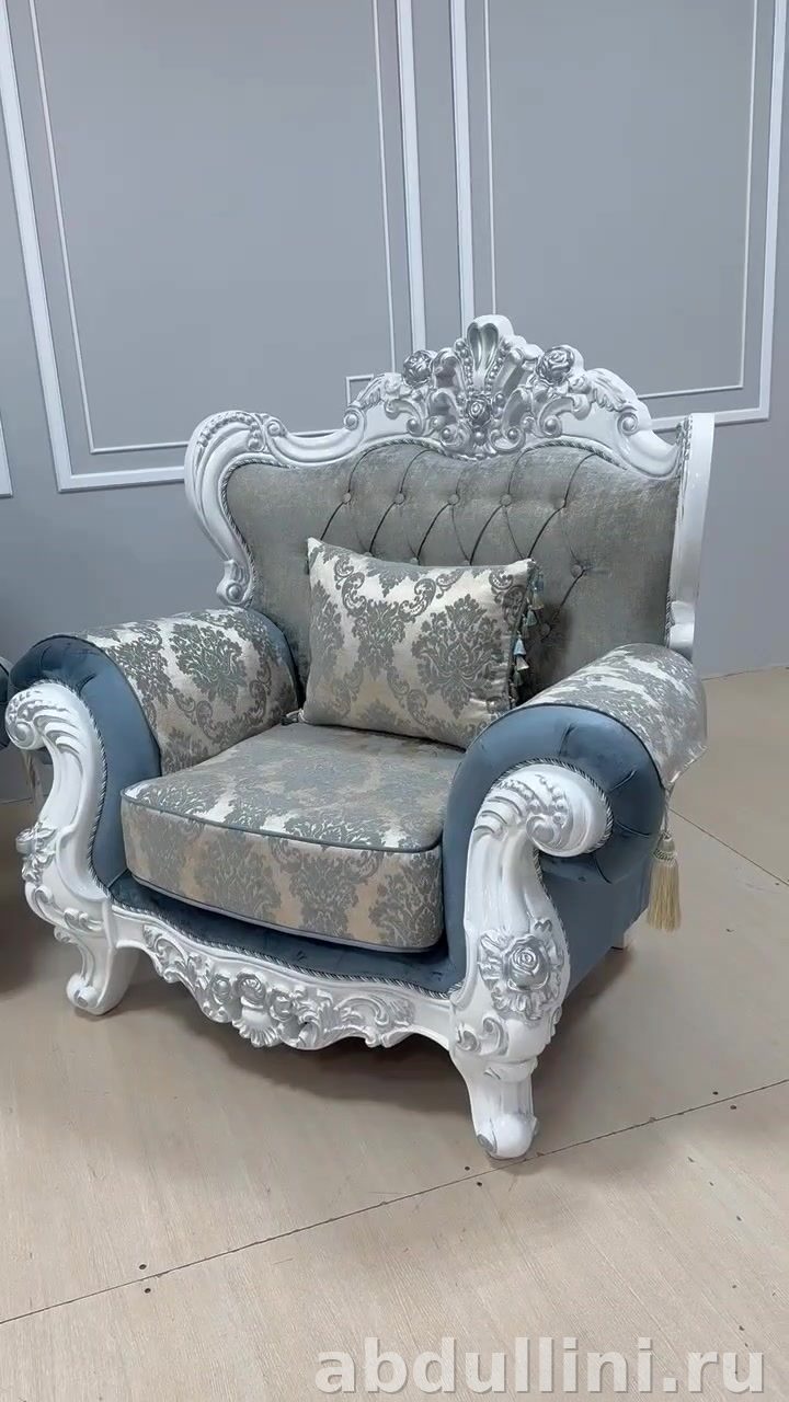 Этот комплект мягкой мебели выполнен в классическом стиле с элементами барокко. Включает трехместный диван и два кресла. Обивка выполнена в приглушенном сером цвете с голубоватым подтоном, дополнена белой резьбой и серебристыми акцентами. Декоративные подушки с цветочным орнаментом добавляют изысканности.