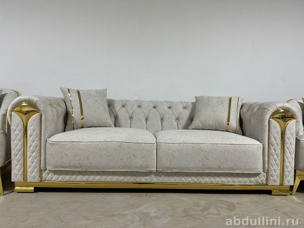 - Декор: капитоне на спинке дивана и боковинах кресел, золотистые металлические ножки
