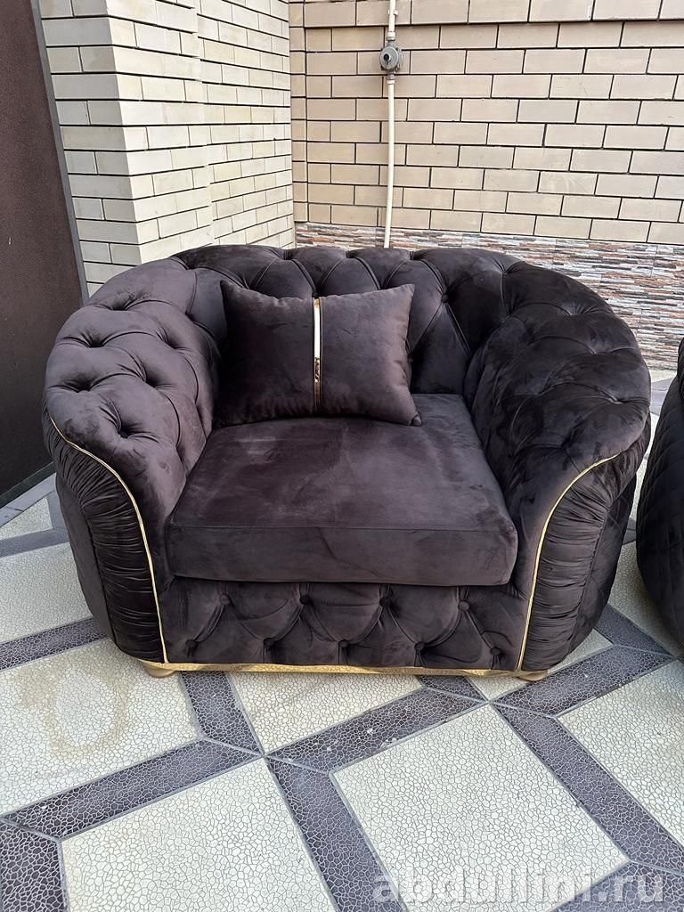 удобный и стильный комплект из трех предметов: диван на три места и два кресла. Обивка — плотный бархат темно-коричневого цвета с золотистой окантовкой. Каретная стяжка на спинках добавляет рельефности.