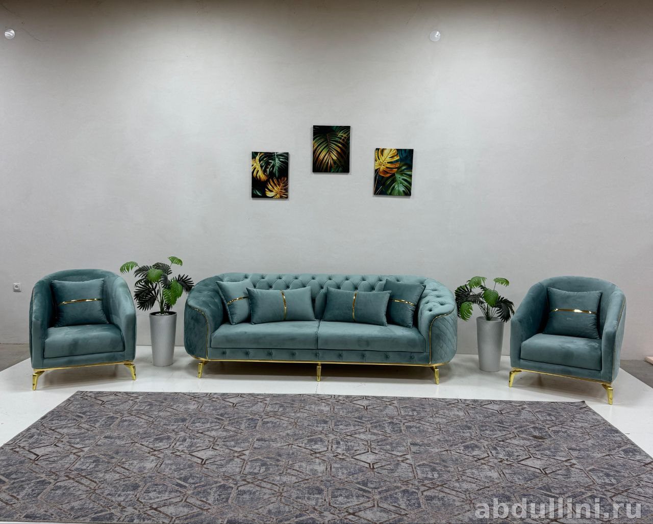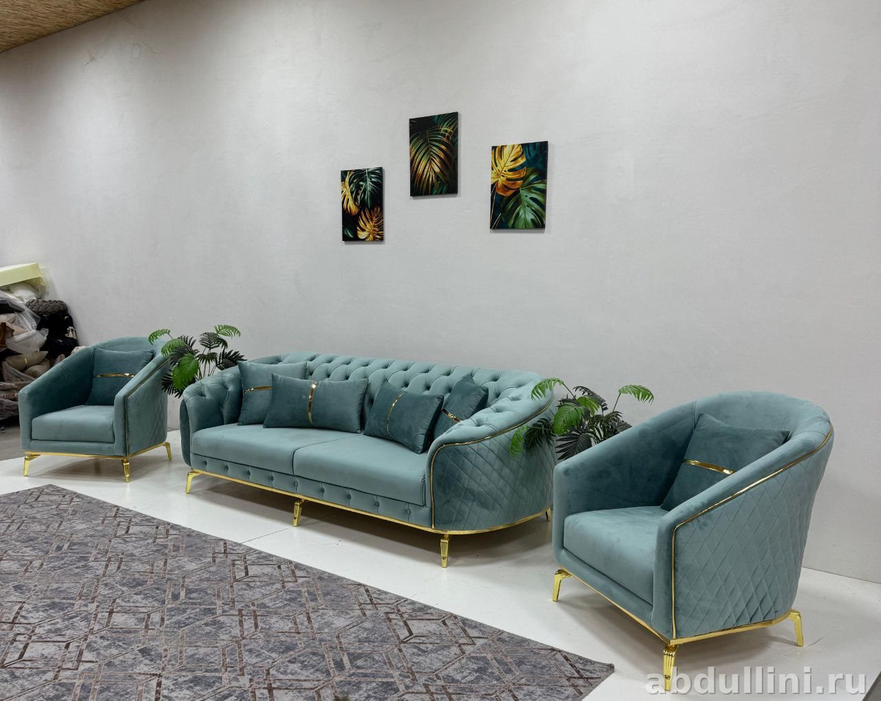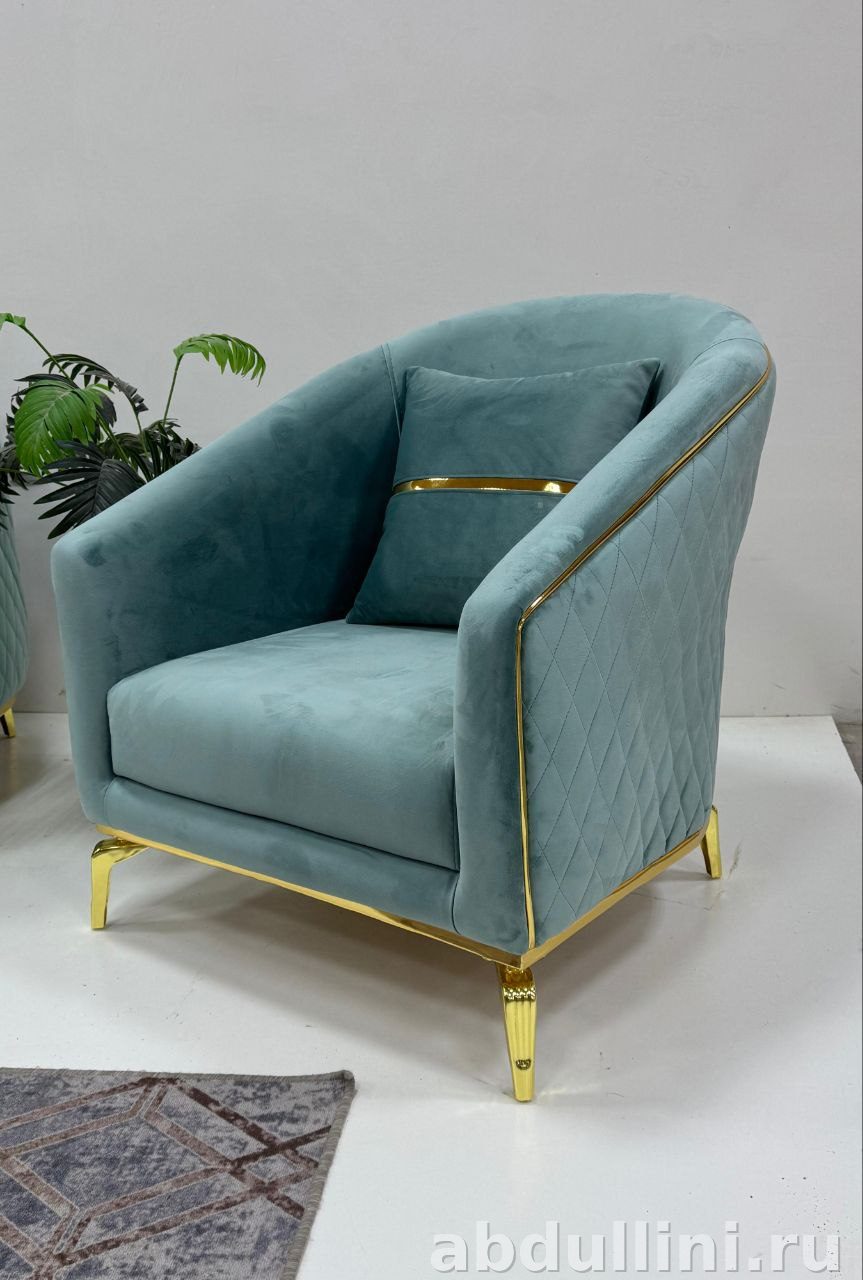 Комплект из дивана и двух кресел в стиле неоклассика. Обивка — бархат бирюзового оттенка с золотистой окантовкой. Диван с ромбовидной стяжкой на спинке и подлокотниках, кресла — с декоративной стяжкой по спинке.
