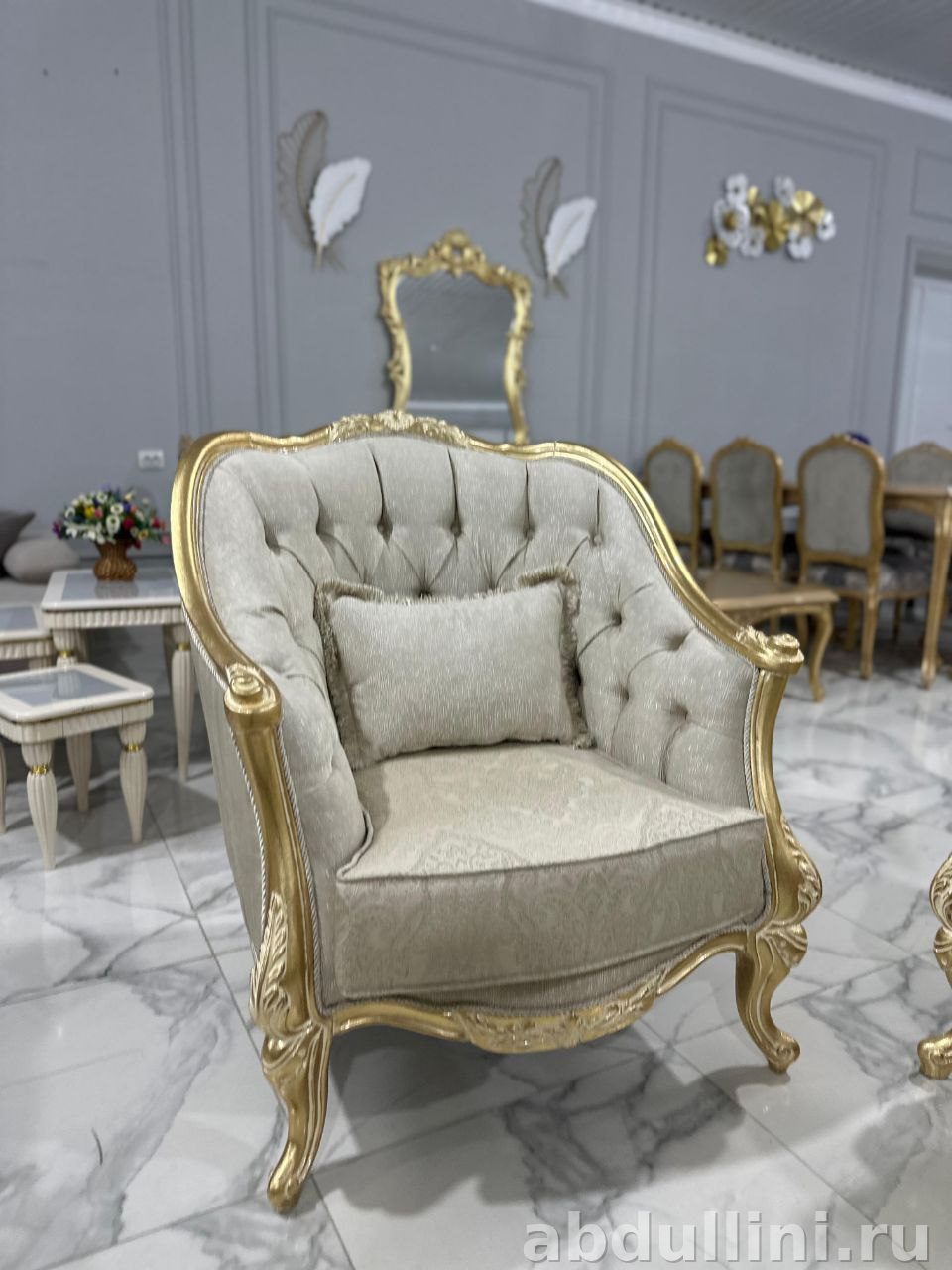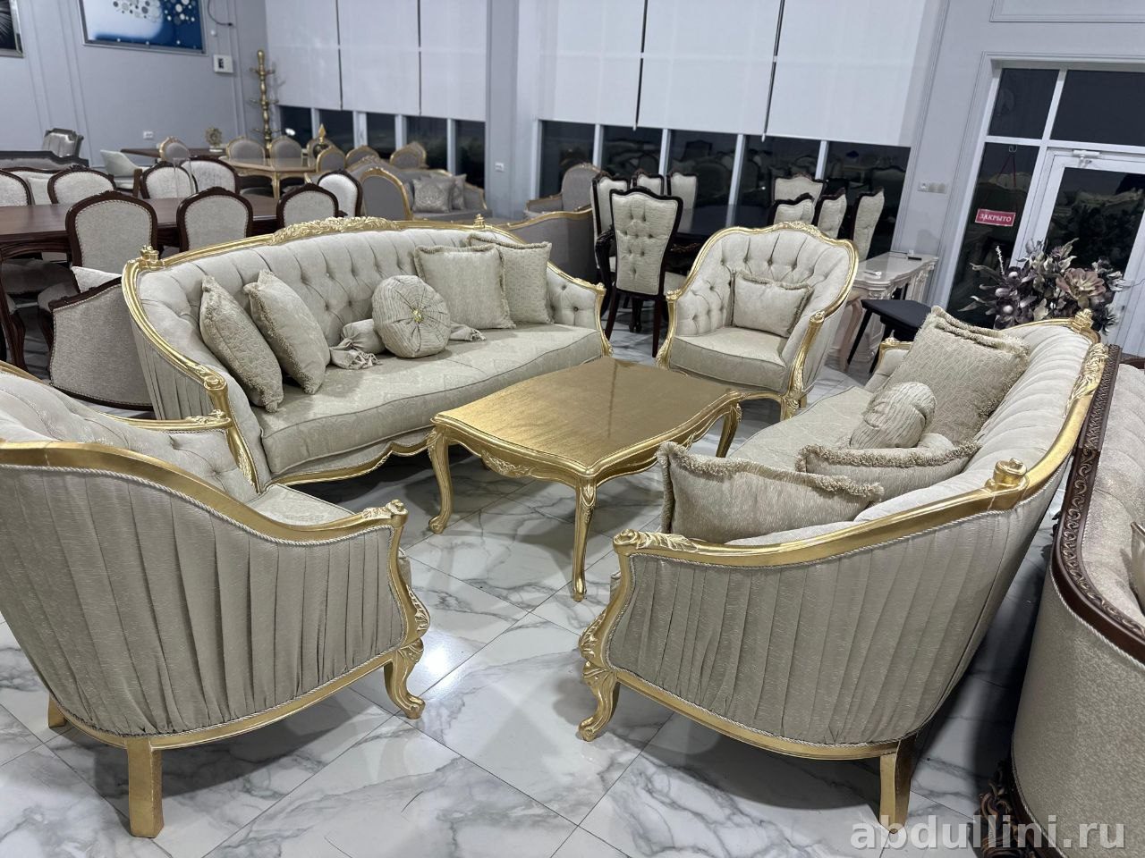 Турецкий комплект в классическом стиле с элементами барокко. Светло-бежевая тканевая обивка с мерцающим эффектом и вертикальными складками. Каркас и ножки — золотистые, с резными узорами. Столешница глянцевая, в тон.