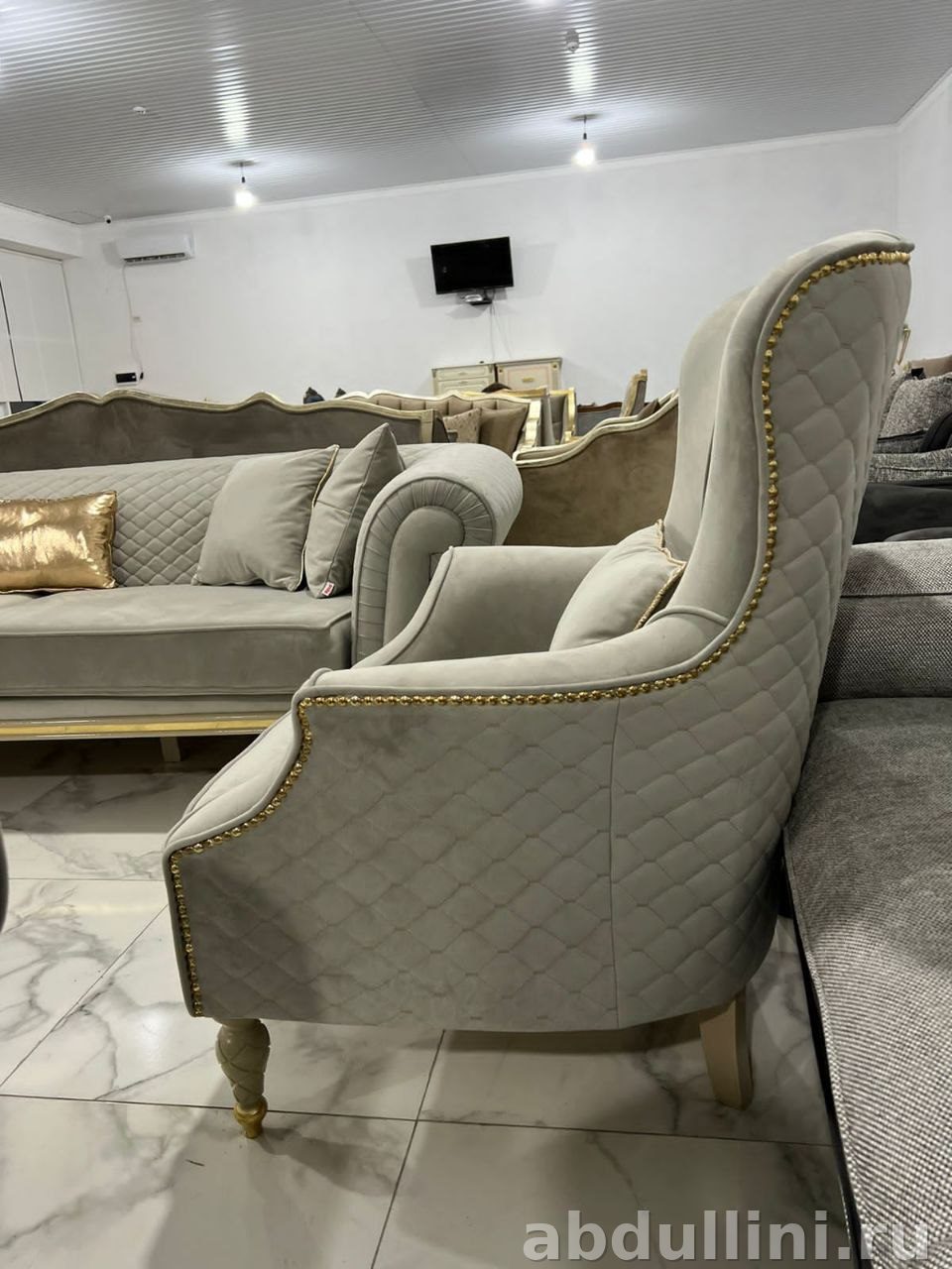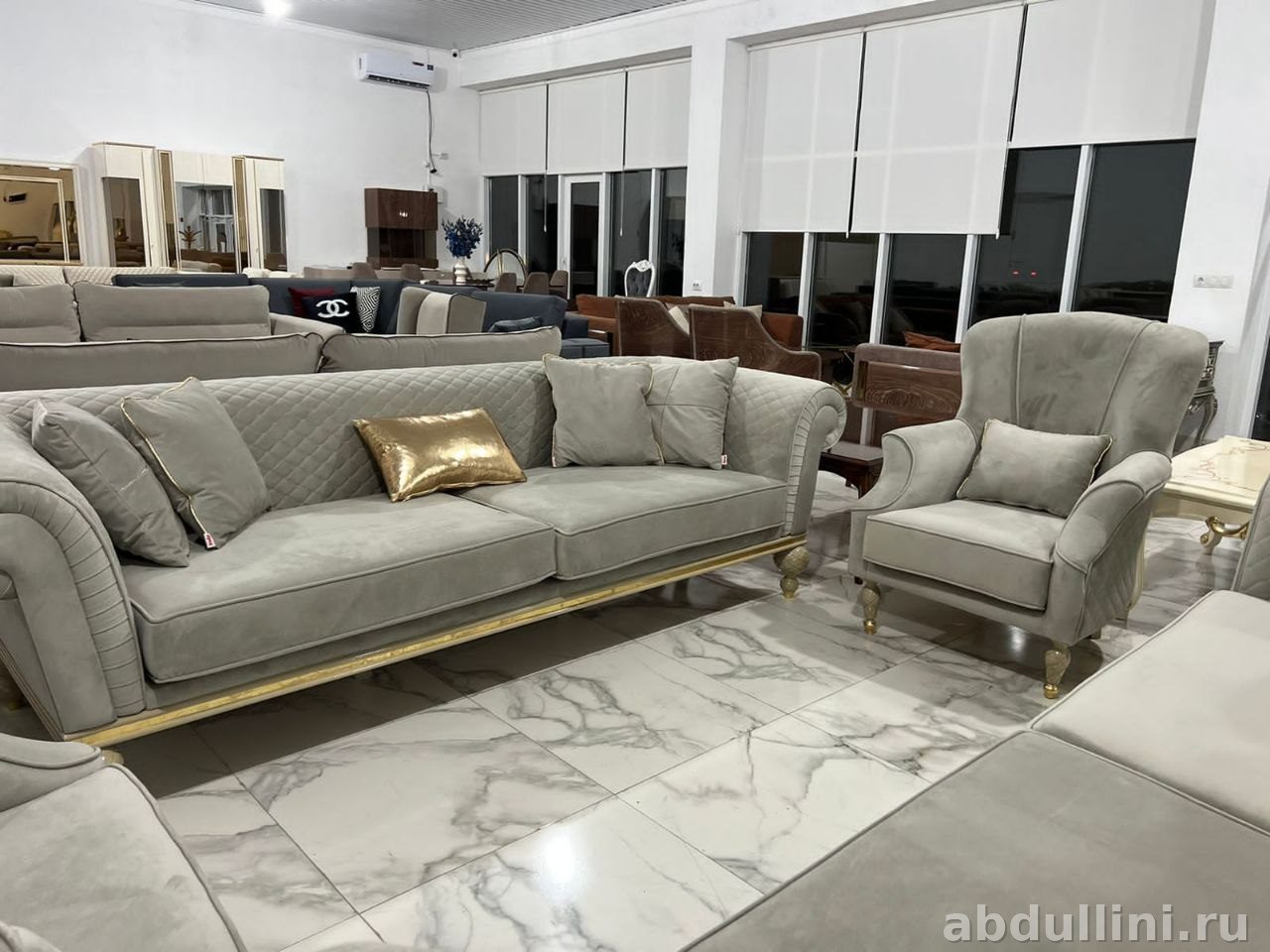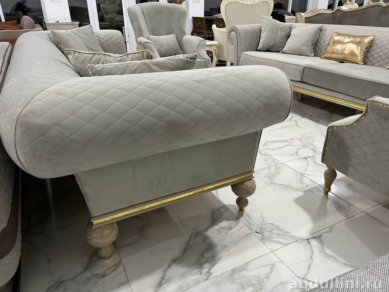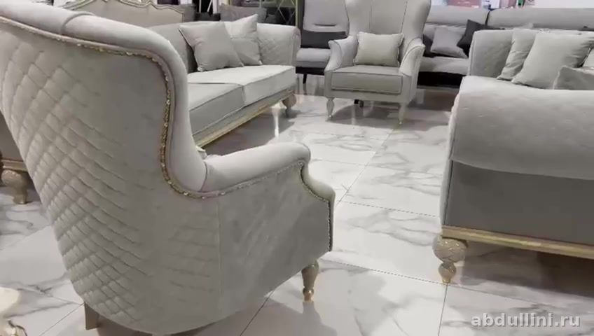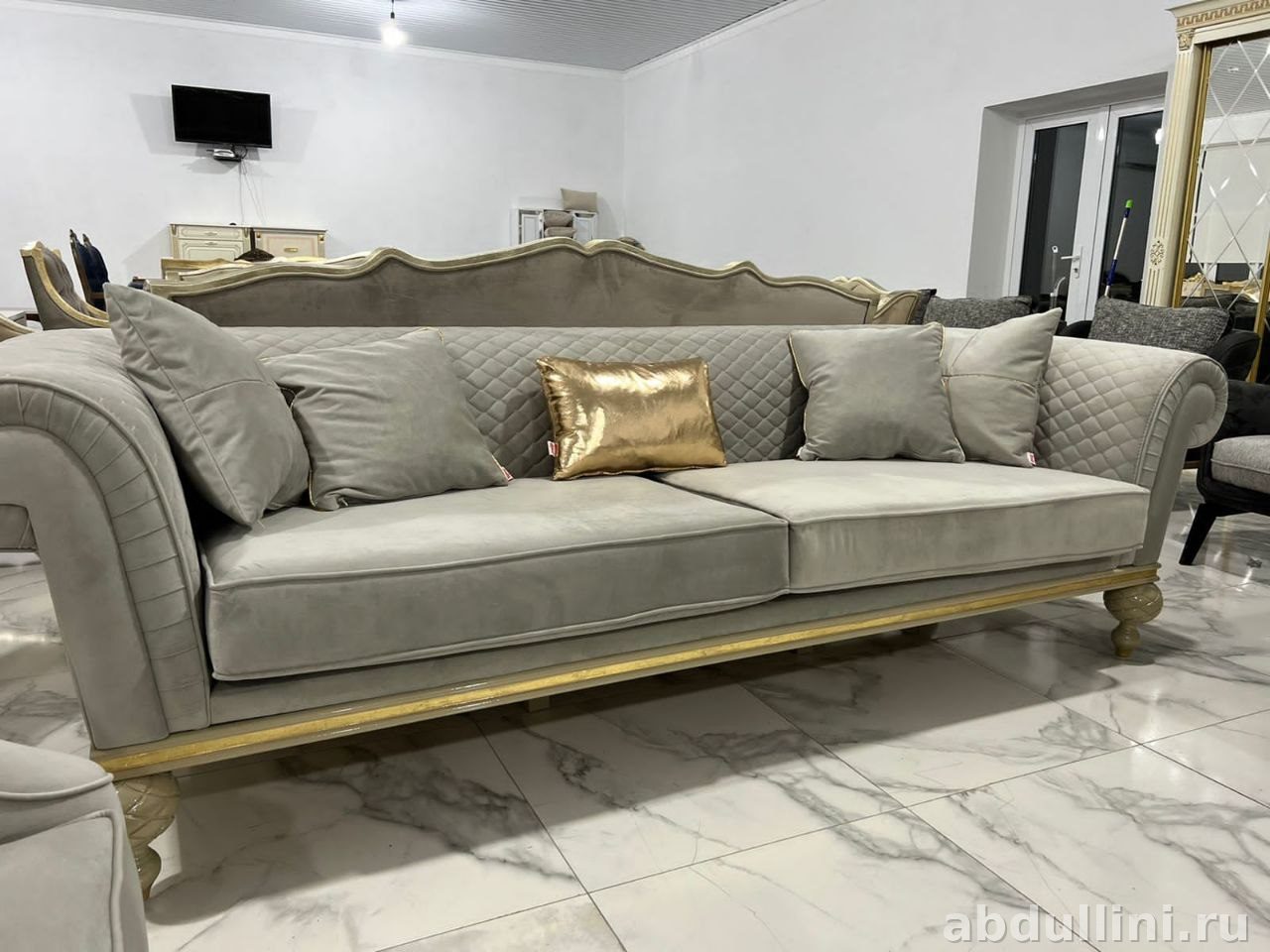 Турецкий комплект в стиле неоклассика: два дивана и два кресла с декоративной прострочкой. Светло-серый велюр с золотистой окантовкой — строго и стильно.