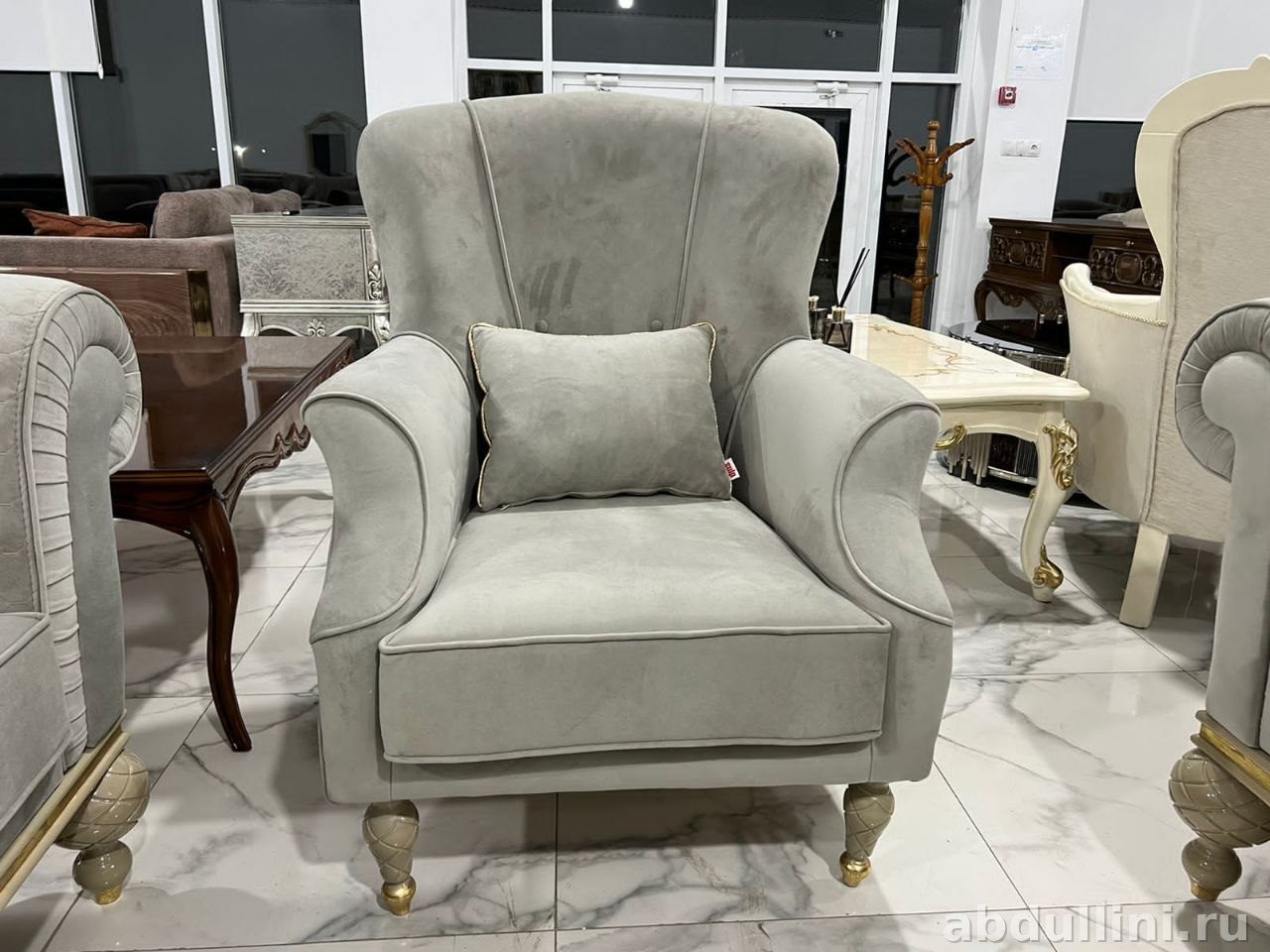 - Материалы: велюр/бархат, деревянные фигурные ножки, наполнитель — ППУ