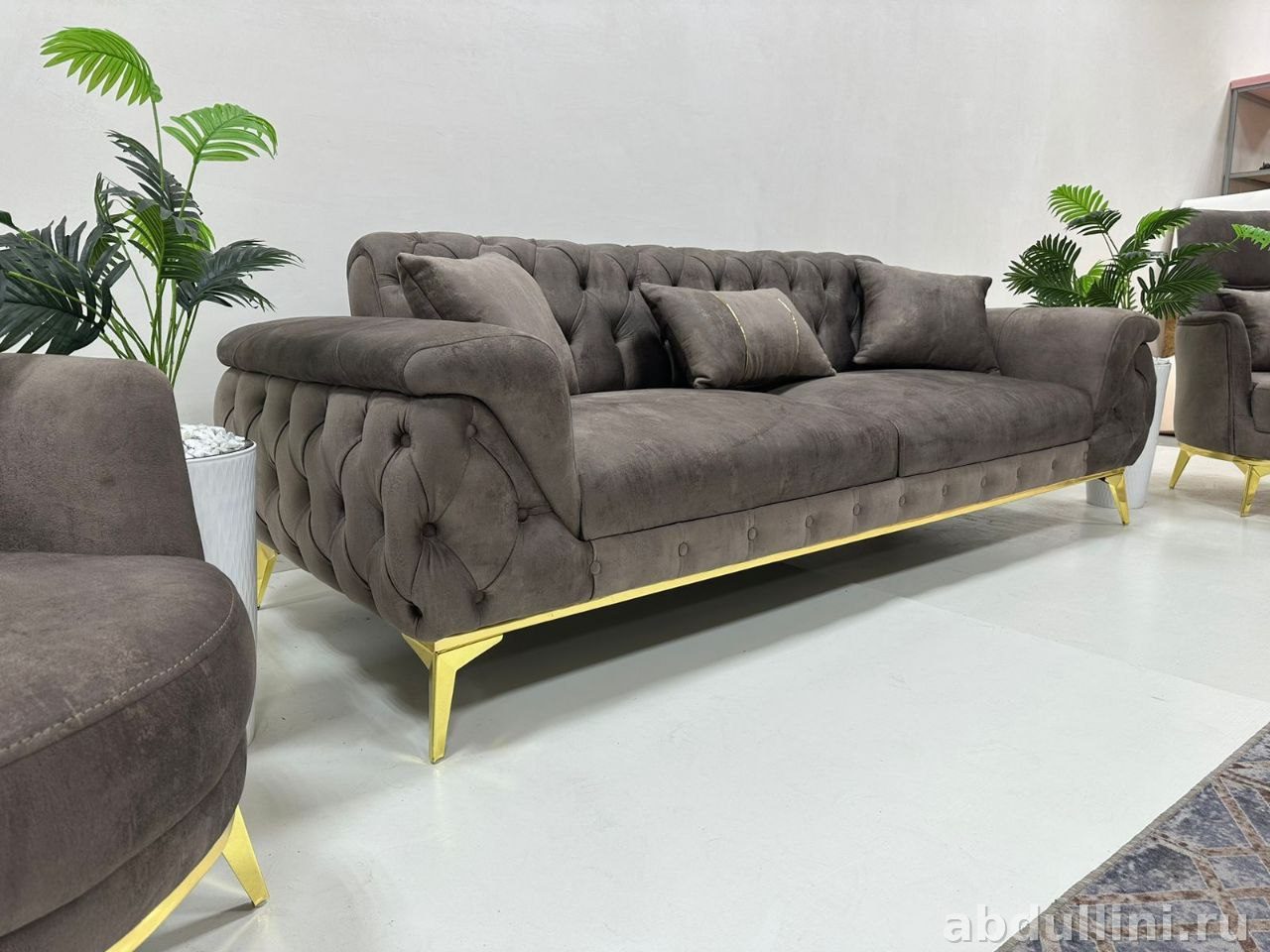 Диван и кресла украшены капитоне (ромбовидная стяжка) на спинке и подлокотниках. Прямые линии и скругленные подлокотники придают мебели модный вид.