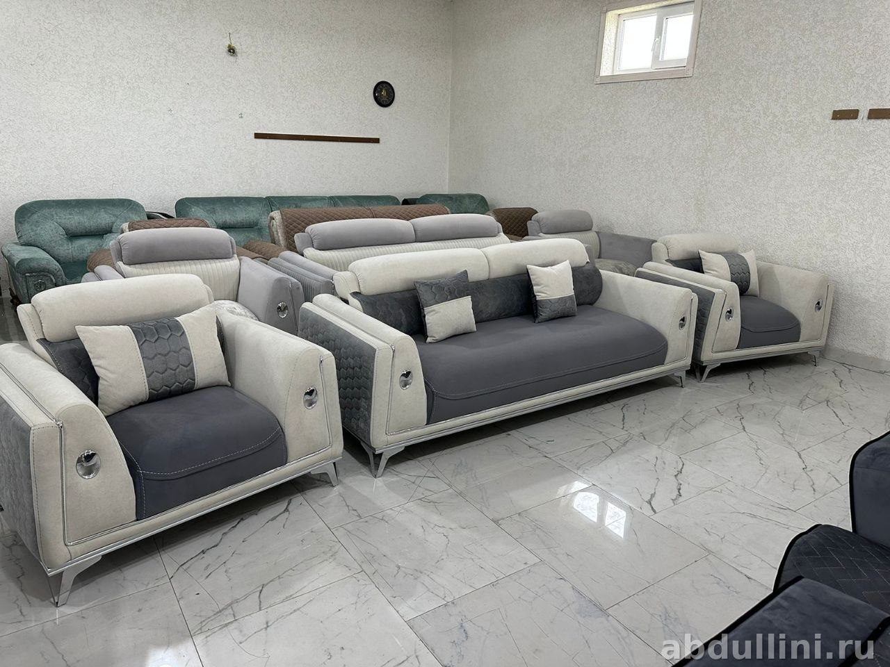 - Конструкция: прямые диваны с мягкими подлокотниками и высокими спинками. Кресла повторяют дизайн диванов.