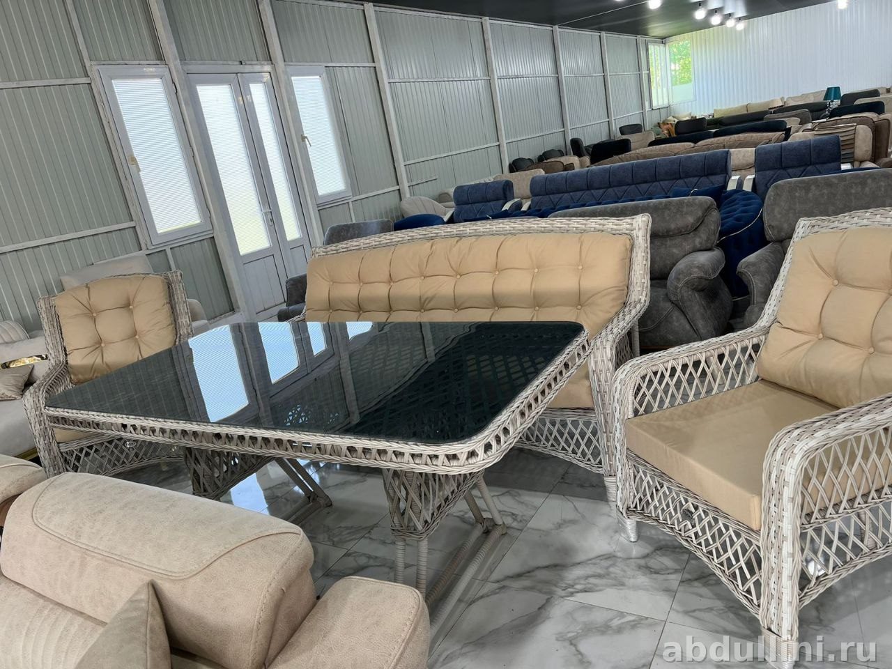 Комплект из дивана, двух кресел и стола в стиле современной ротанговой мебели. Идеально подходит для террасы, веранды или гостиной. Мебель выполнена из искусственного ротанга (полиротанга), устойчивого к влаге и ультрафиолету, что делает её долговечной и практичной.