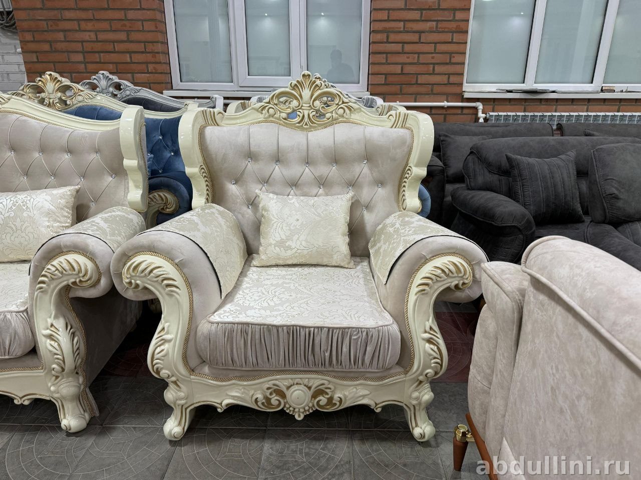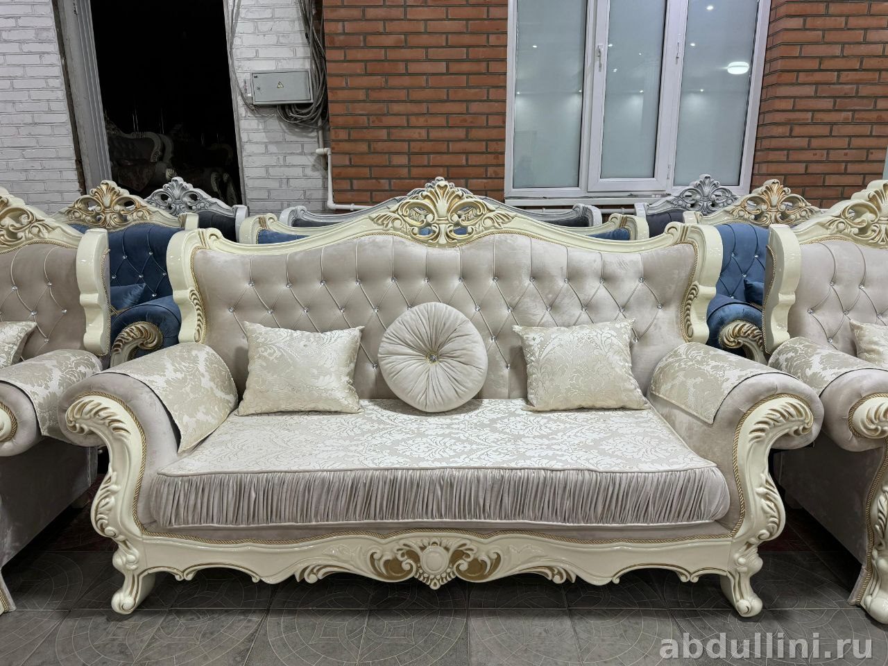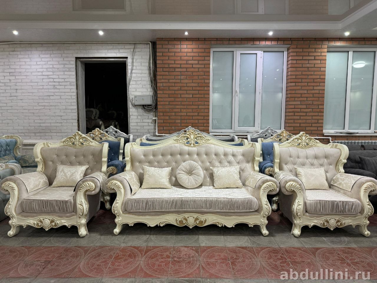 Диван и кресла в стиле классика с элементами декора. Подойдут для гостиной или зала. Обивка кремового цвета с бежевым подтоном, каркас в цвет слоновой кости с золотистыми акцентами.