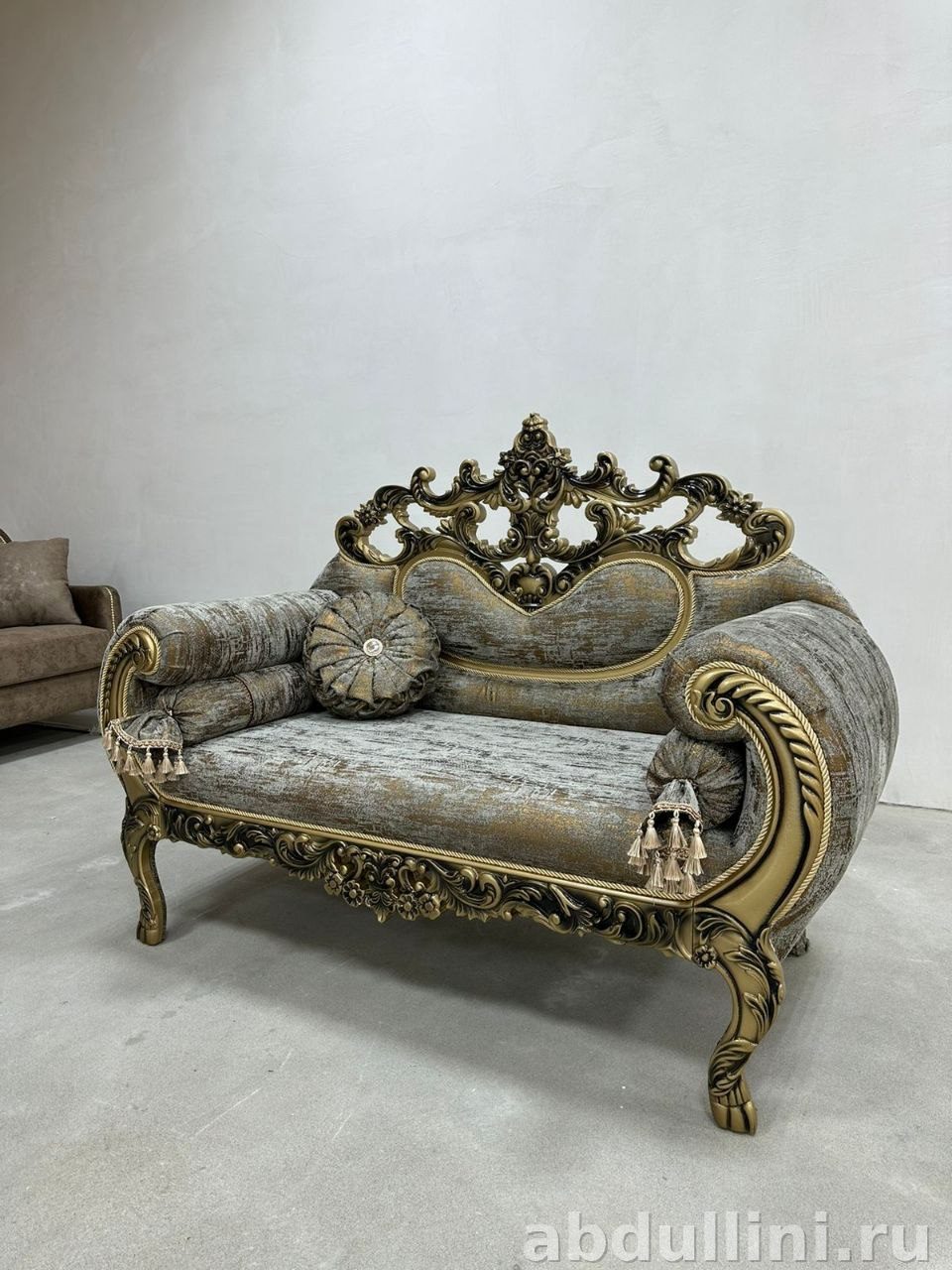- Стиль: классика с элементами барокко — изогнутые линии, резной декор, кисточки на валиках.