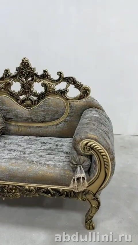 Цветовая гамма — сложный оттенок, сочетающий серый, золотистый и оливковый тона. Ткань обивки текстурированная, с переливами, создающими эффект старины. Каркас дивана выполнен в золотистом цвете с бронзовым оттенком, отделка глянцевая, подчеркивающая резные узоры.