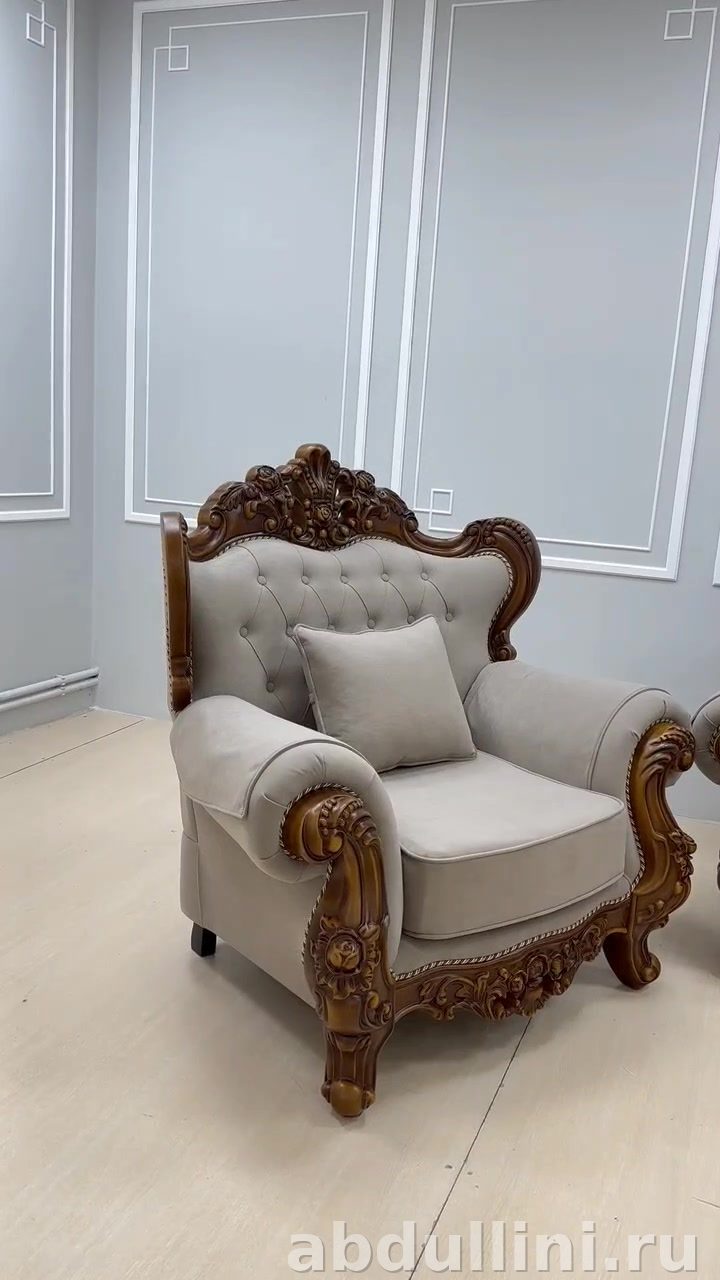 Мебель изготовлена из качественных материалов: прочный деревянный каркас, мягкая тканевая обивка и удобный наполнитель. Резные узоры на подлокотниках и спинке, а также капитоне на декоративных элементах подчеркивают изысканность дизайна. Комплект подойдет для просторных помещений и станет центром внимания в интерьере.