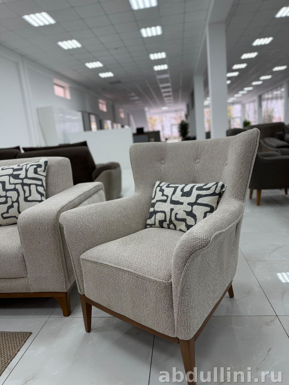 Диван и кресла обтянуты светло-бежевой тканью с текстурой, напоминающей рогожку или лен. Отделка матовая, что делает мебель универсальной для любого интерьера. Декоративные подушки с черно-белым геометрическим узором добавляют изюминку. Каркас и ножки выполнены из дерева с коричневой отделкой, что сочетается с ножками столика.