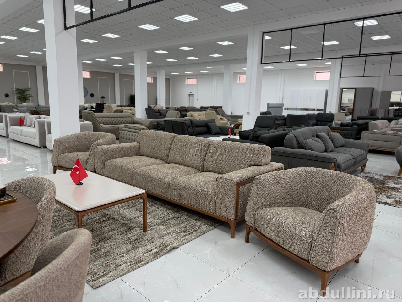 Комплект мебели турецкого производства для гостиной. Включает трехместный диван, два кресла и журнальный столик. Стиль — модный, с акцентом на практичность и комфорт.
