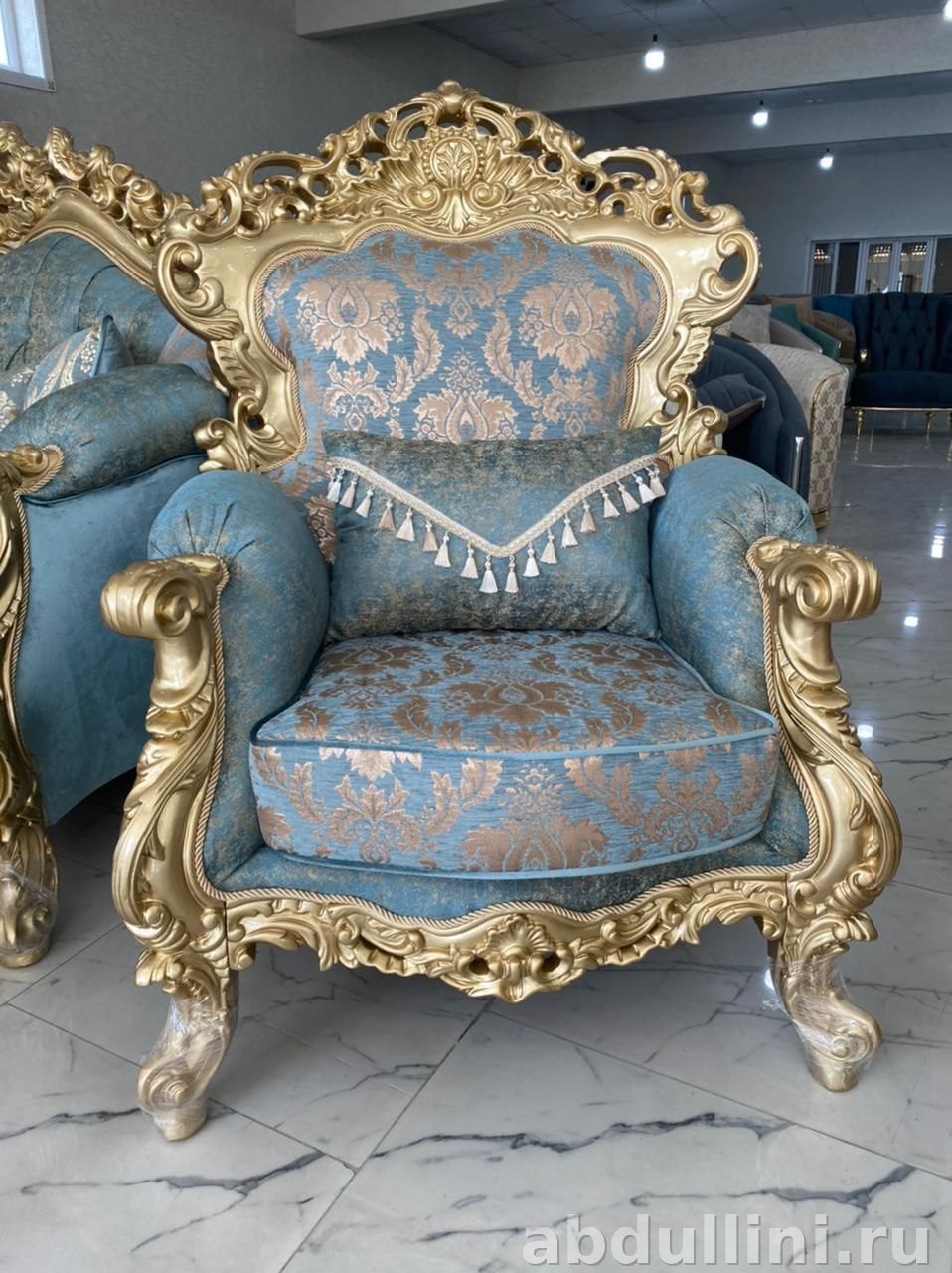 - Декоративные элементы: резные золотистые детали на каркасе, капитоне на спинках, кисточки на подушках.