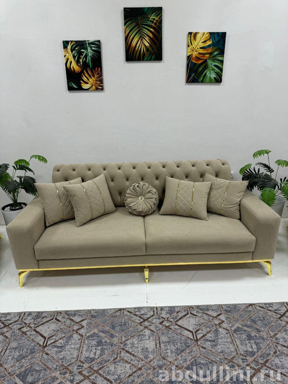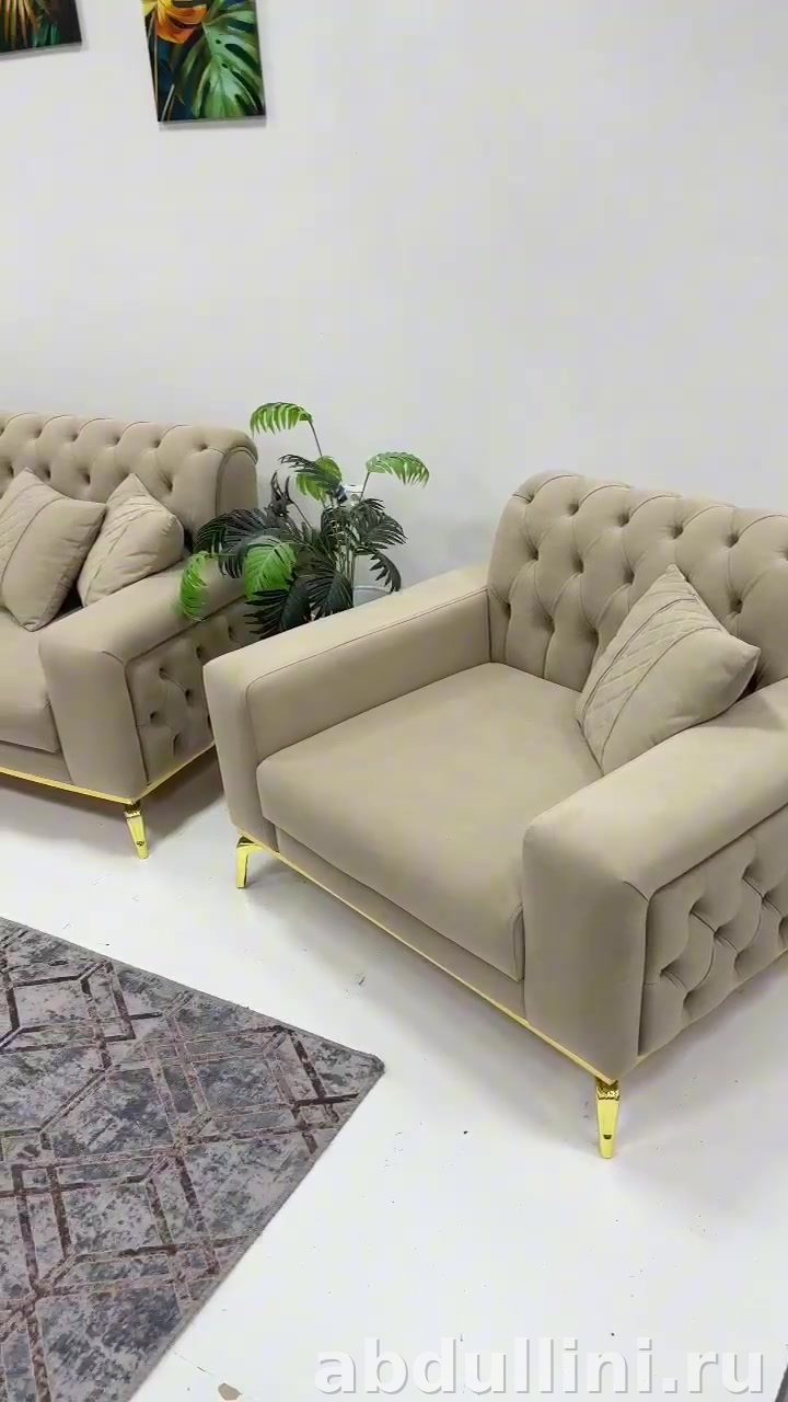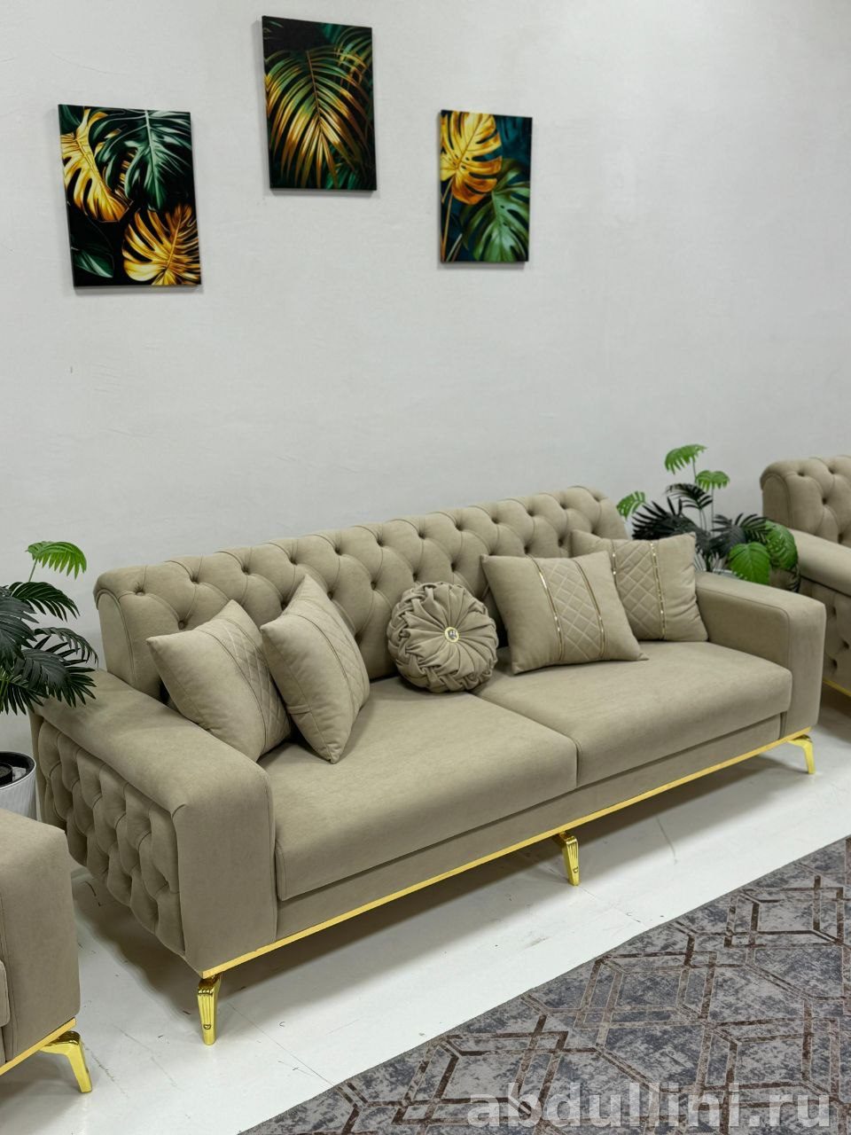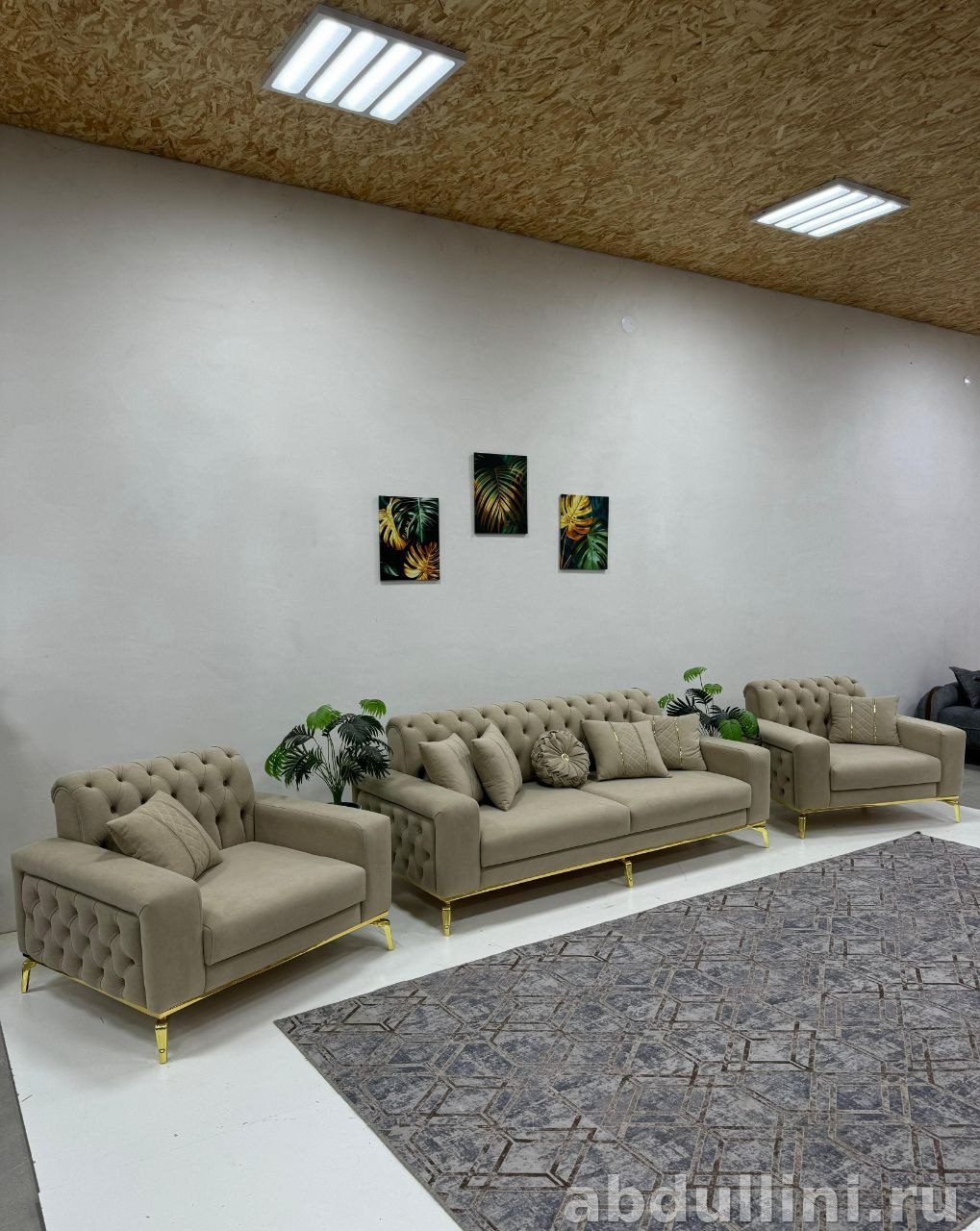Комплект мебели 3789 от производителя — это диван и два кресла, выполненные в современном стиле с элементами классики. Основной цвет обивки — бежевый с серым оттенком, который легко впишется в любой интерьер. Каретная стяжка (капитоне) на спинках и боковых частях придает мебели красивый вид.