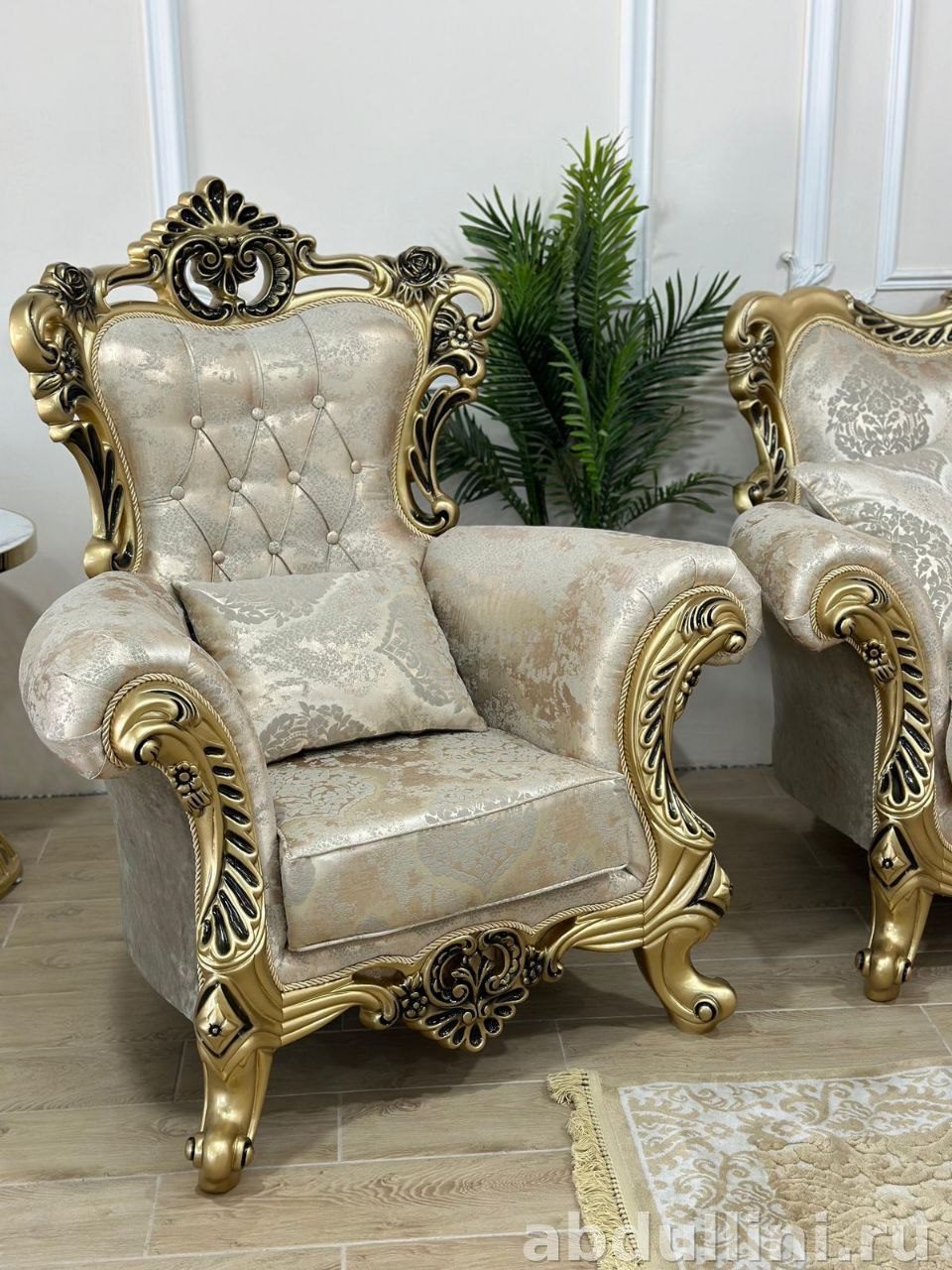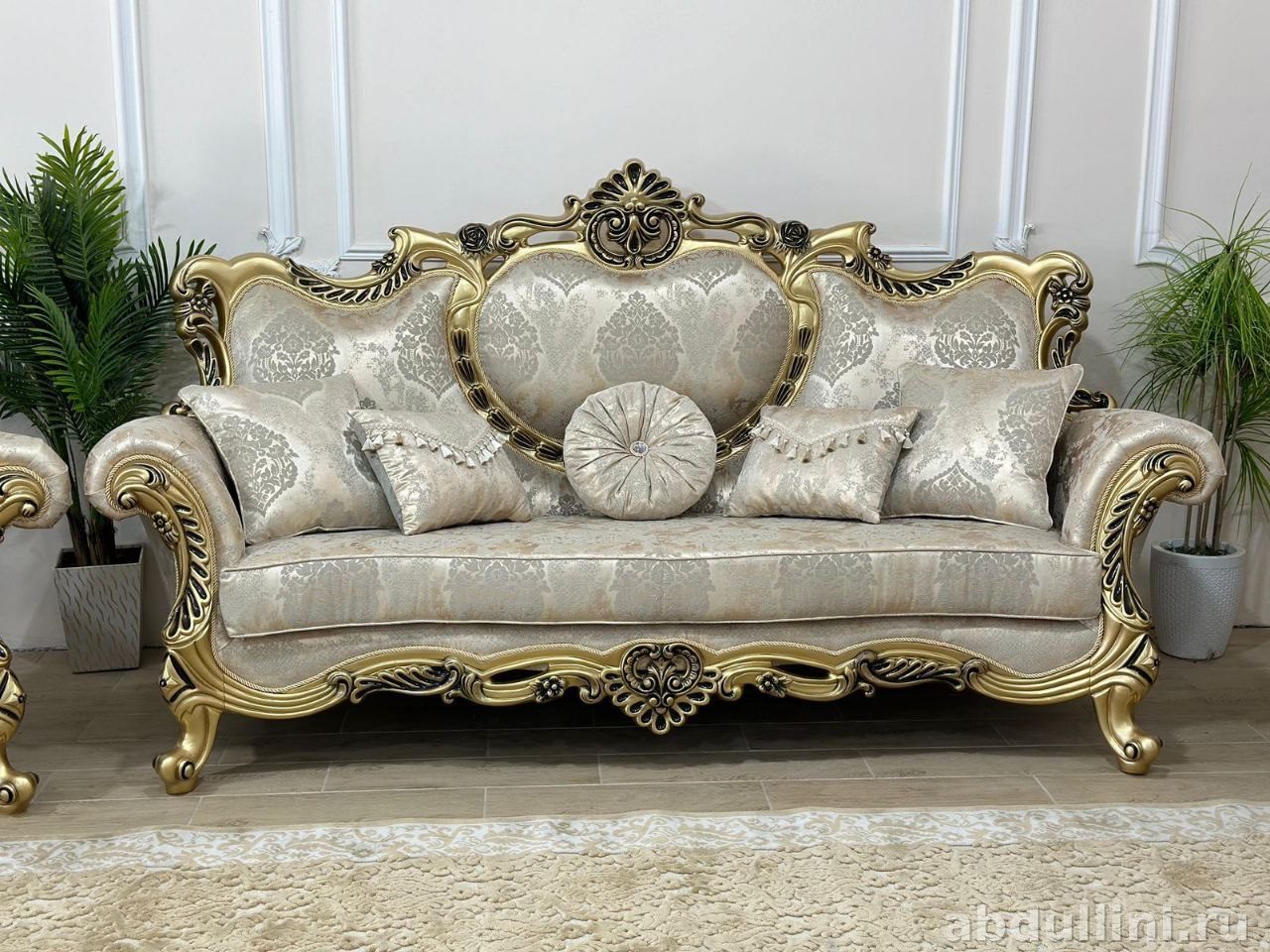 Комплект мебели 2819 — это стильное решение для гостиной или зала в классическом стиле. В набор входит диван и два кресла, дополненные семью декоративными подушками. Дизайн выполнен с акцентом на детали: золотой каркас с резными элементами, жаккардовая обивка кремового цвета и декоративные кисточки на подушках.