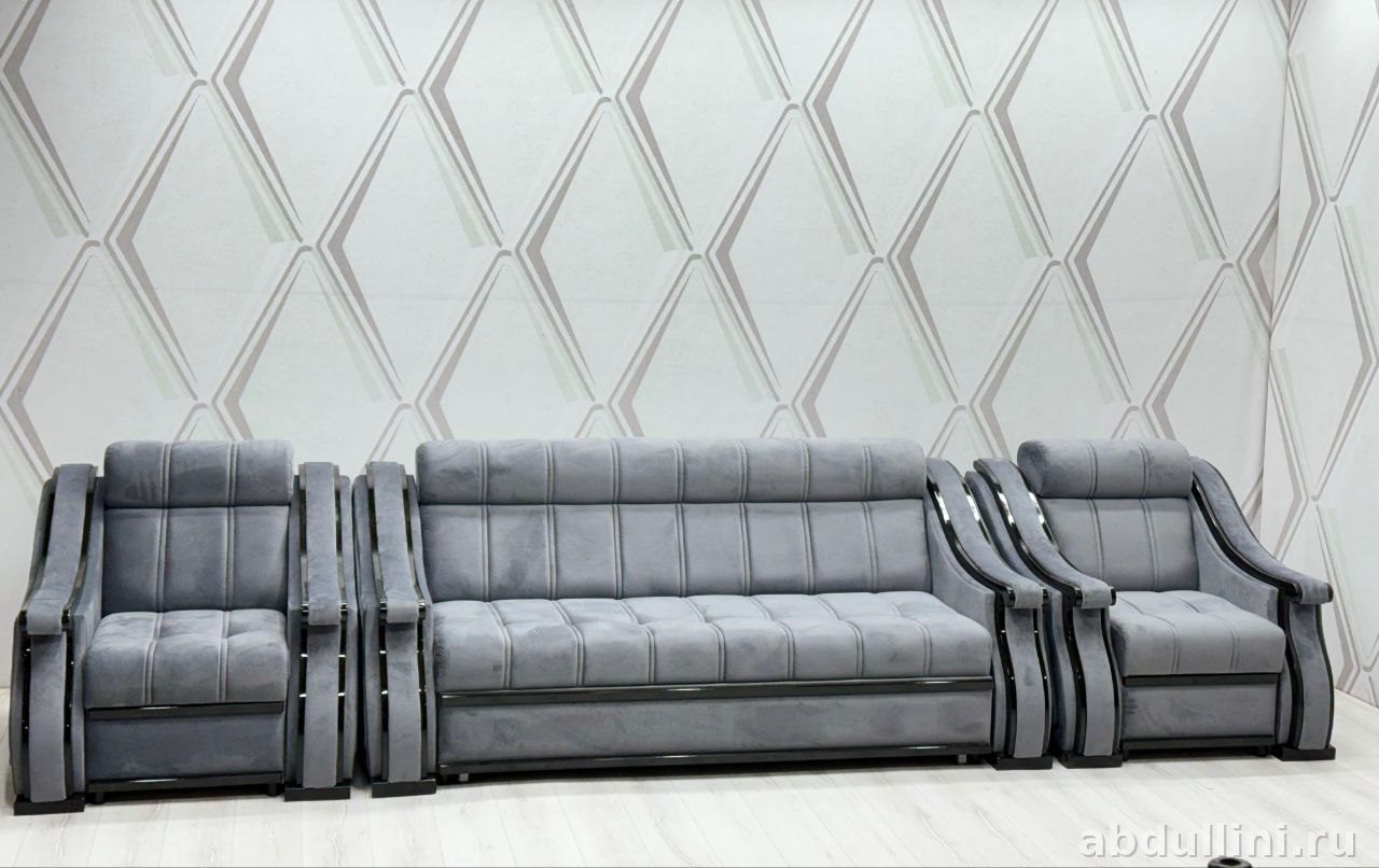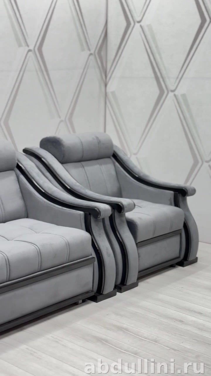 Этот комплект включает трехместный диван и два кресла, выполненные в современном стиле с элементами неоклассики. Обивка — мягкая серо-матовой ткани, похожей на велюр, с геометрическими строчками, создающими прямоугольные секции на спинке и сиденье. Подлокотники украшены контрастными вставками из лакированного материала, добавляющими изысканности.