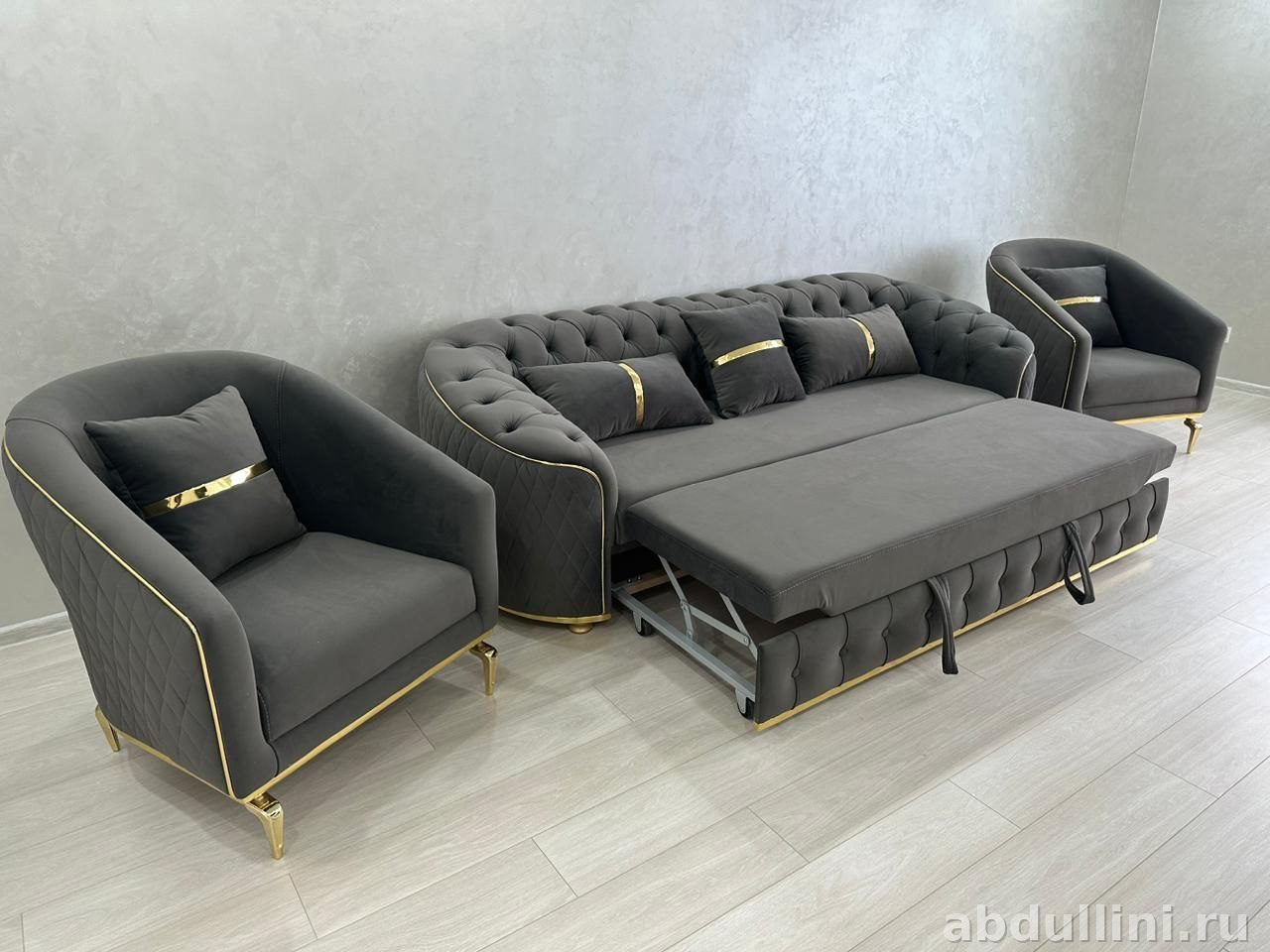 Мебель выполнена в современном стиле с элементами классики. Ножки дивана и кресел — металлические с золотистым покрытием. Декоративная стяжка капитоне в виде ромбов придает объема и элегантности.