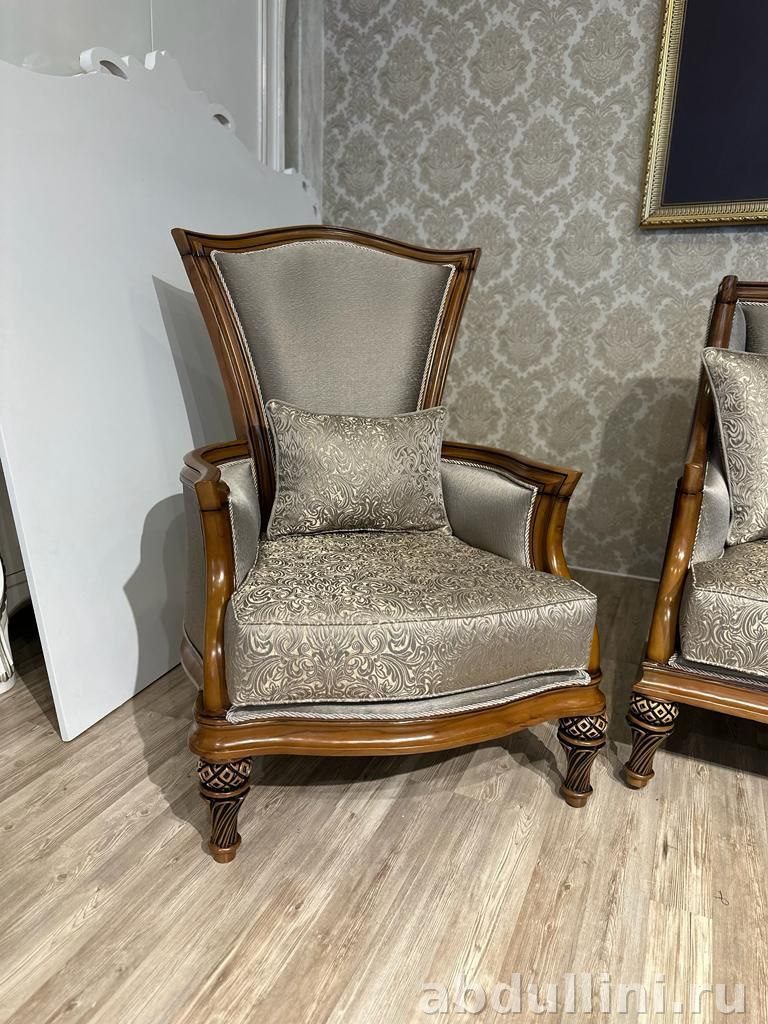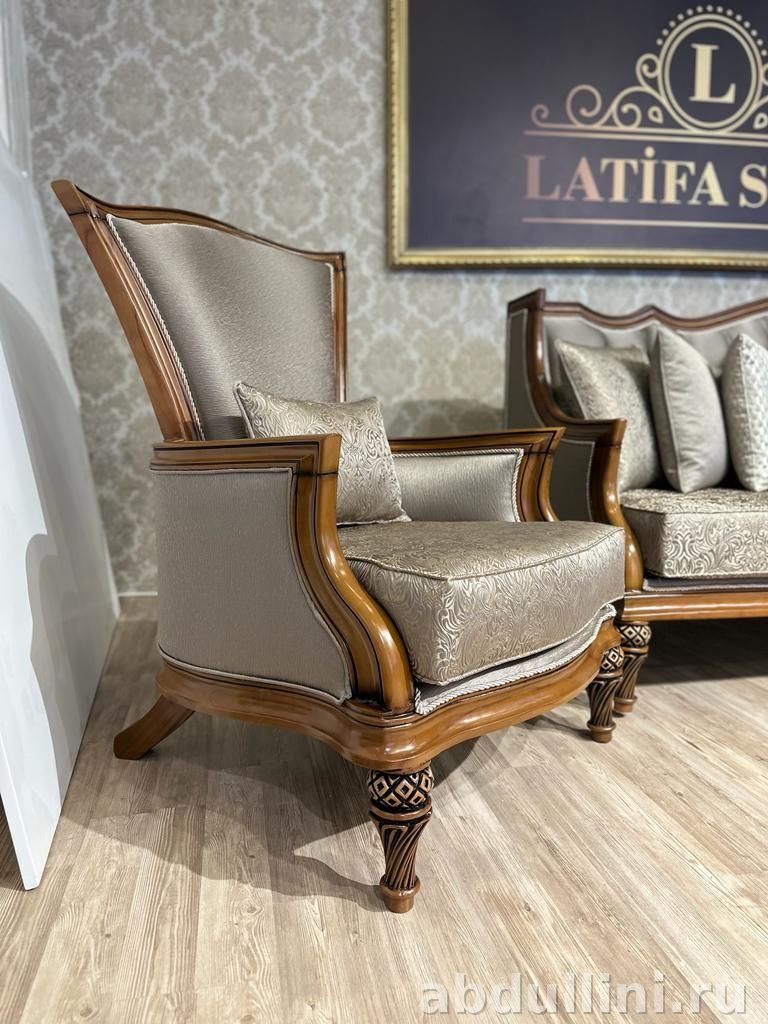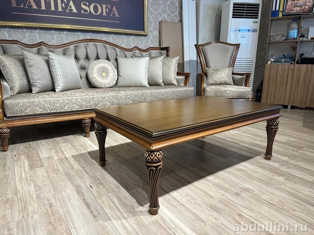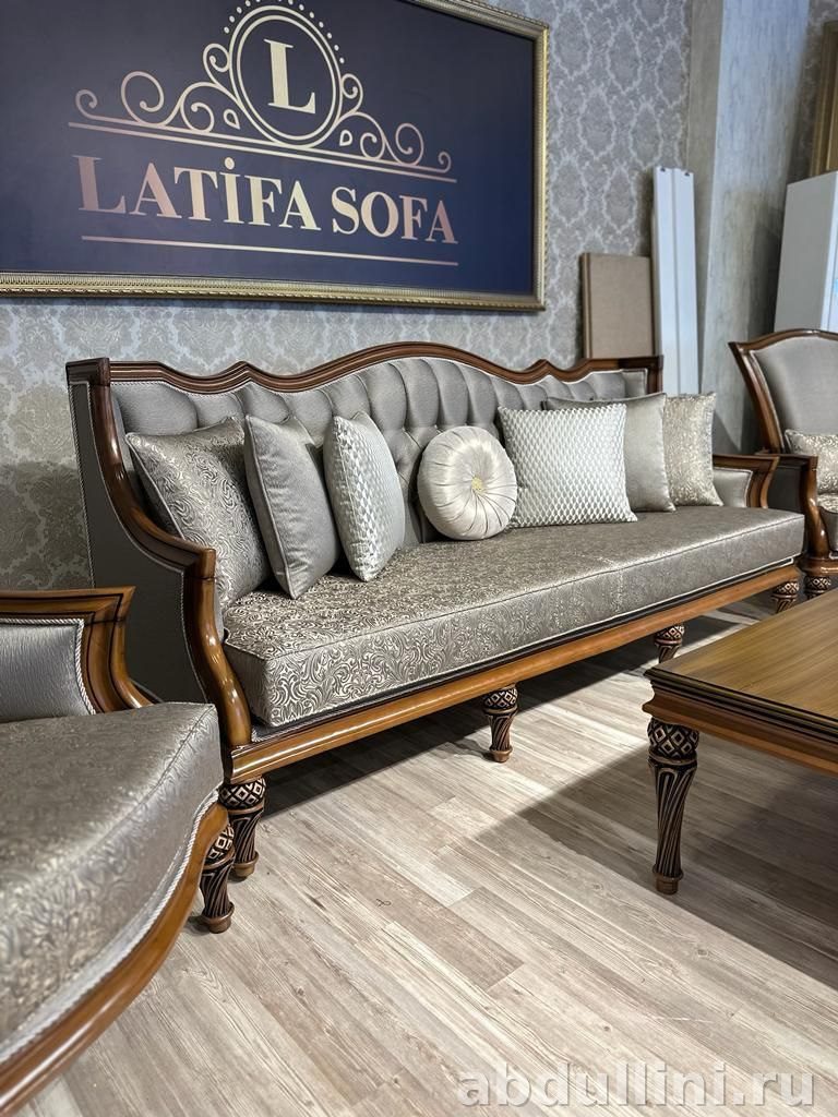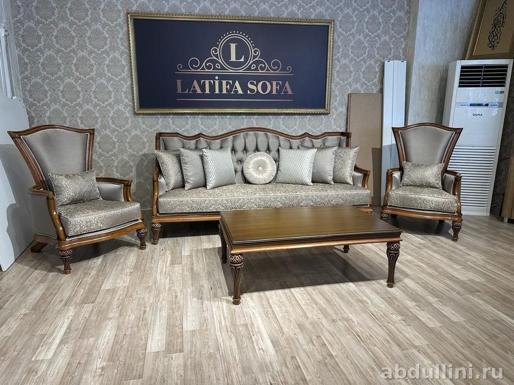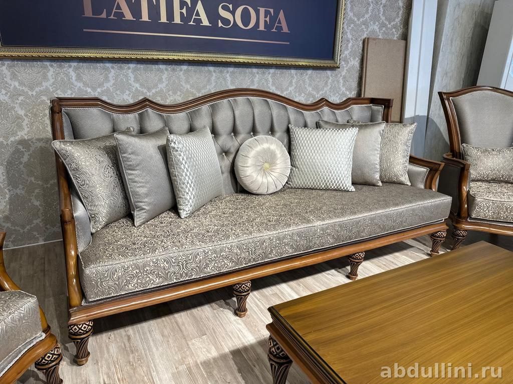 Турецкий комплект из дивана, двух кресел и журнального столика. Обивка — серый жаккард с золотистым узором, каркас — дерево с темной глянцевой отделкой. Столешница коричневая, глянцевая.