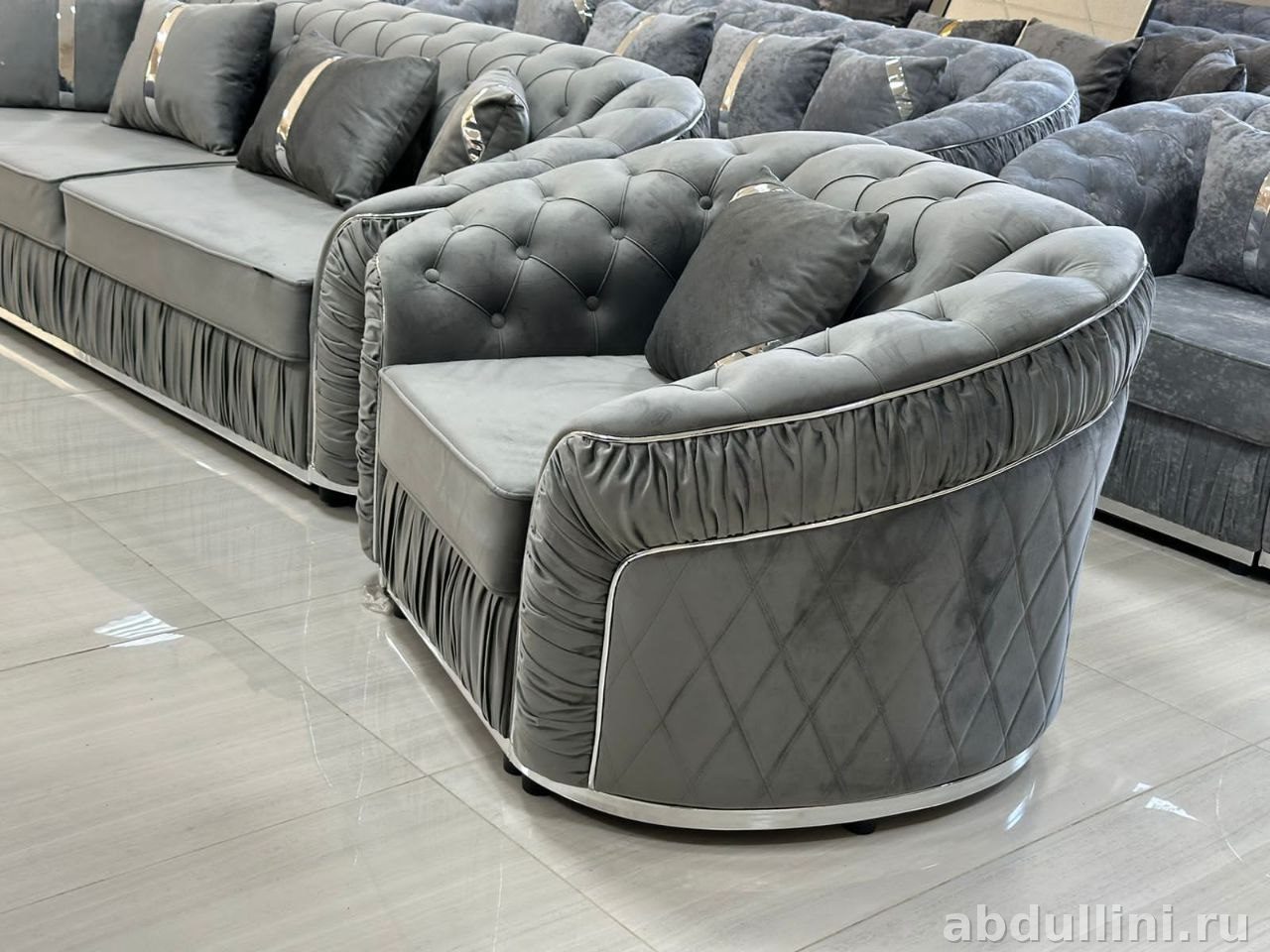 Диван и кресло украшены ромбовидной стяжкой (капитоне) на спинках и боковинах, а также декоративной серебристой полосой по контуру. Нижняя часть мебели оформлена драпировкой с вертикальными складками, что добавляет изысканности. Подушки в комплекте выполнены в тон основной обивки и дополнены серебристыми вставками.