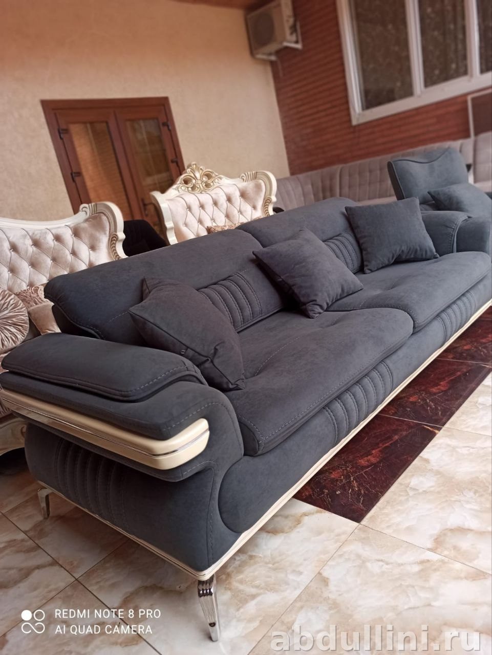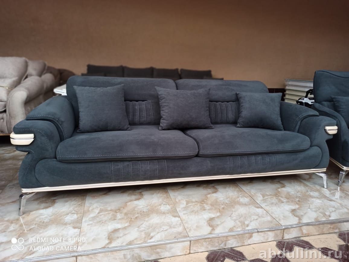 - Комплектация: диван трехместный, два кресла, пять декоративных подушек.