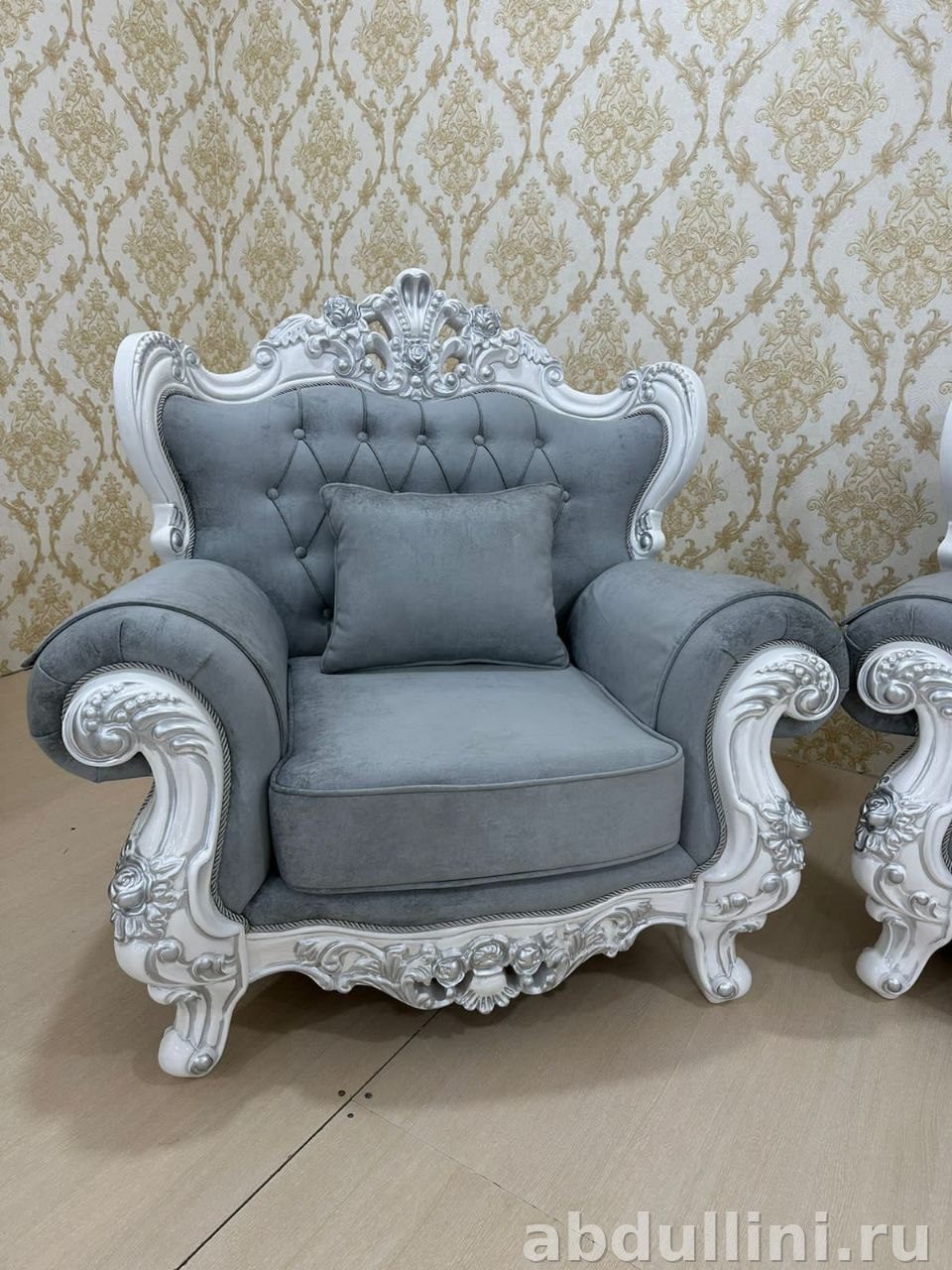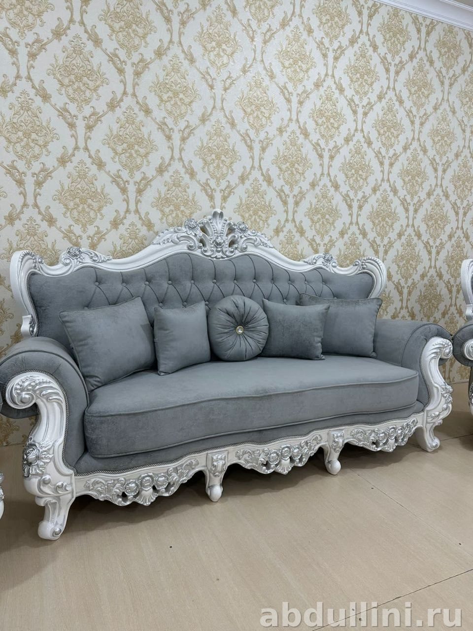 - Особенности: резные узоры на каркасе, капитоне на спинках, съемные подушки, короткие ножки в стиле барокко.