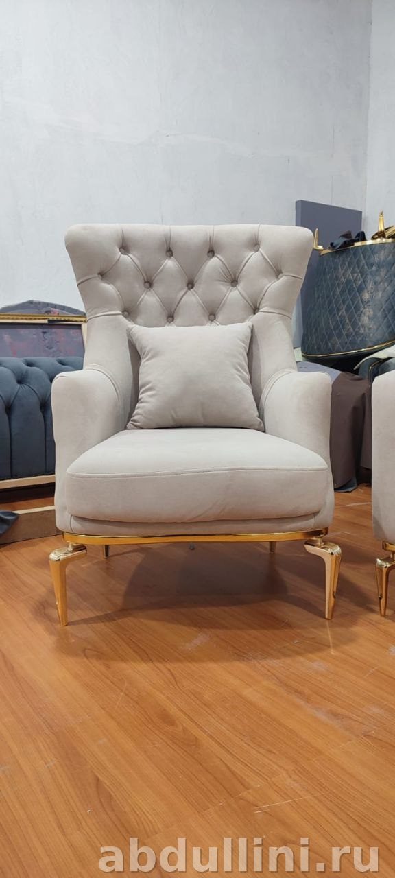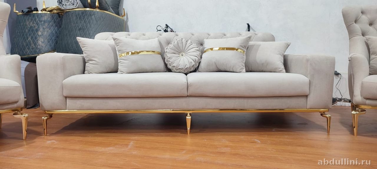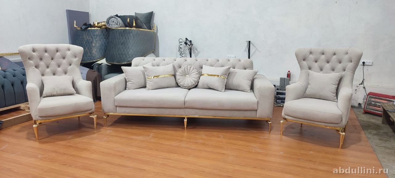 Комплект включает двухместный диван и два кресла в стиле неоклассика. Обивка — светлый бежевый велюр с матовой текстурой, декорирована золотистыми элементами и ромбовидной стяжкой (капитоне). Каркас выполнен из массива дерева, ножки — металлические с золотистым покрытием. Наполнитель — высокоэластичный ППУ для долговечности и комфорта.