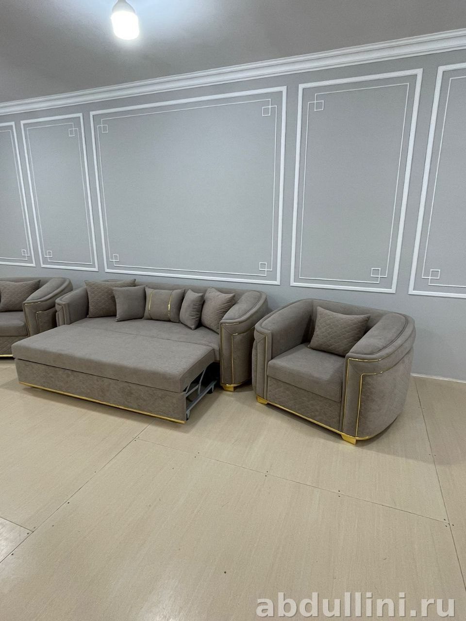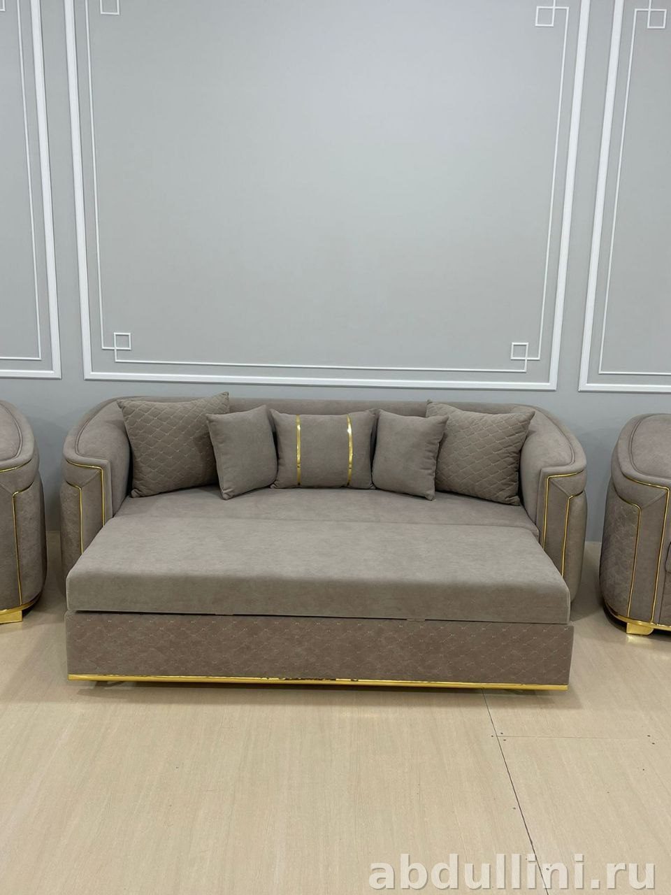 Комплект мягкой мебели Гранд 2614 включает трехместный диван и два полукруглых кресла. Обивка выполнена в приглушенном серо-бежевом цвете с матовой текстурой и едва заметным ромбовидным узором. Декоративные золотистые полосы подчеркивают контуры подлокотников, основания и ножек, добавляя изысканности.