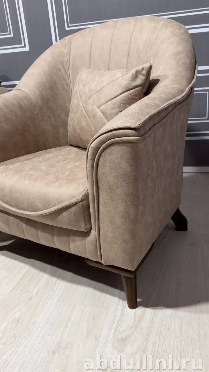 Мебель выполнена в стиле, сочетающем элементы неоклассики и модерна. Плавные линии и сдержанная цветовая гамма подчеркивают классический дизайн, а лаконичные формы добавляют современности. Декоративные элементы, такие как валики с золотистыми кольцами на подлокотниках дивана и вертикальная прострочка на спинках кресел, добавляют рельефности и визуального интереса.