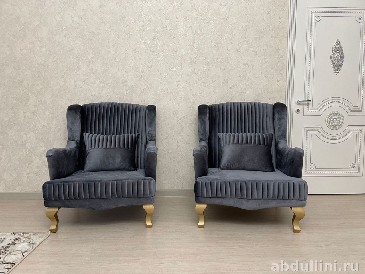 Комплект из дивана и двух кресел в насыщенном сером цвете. Обивка — бархатистый велюр, приятный на ощупь. Каркас из массива дерева, ножки с золотистым покрытием.