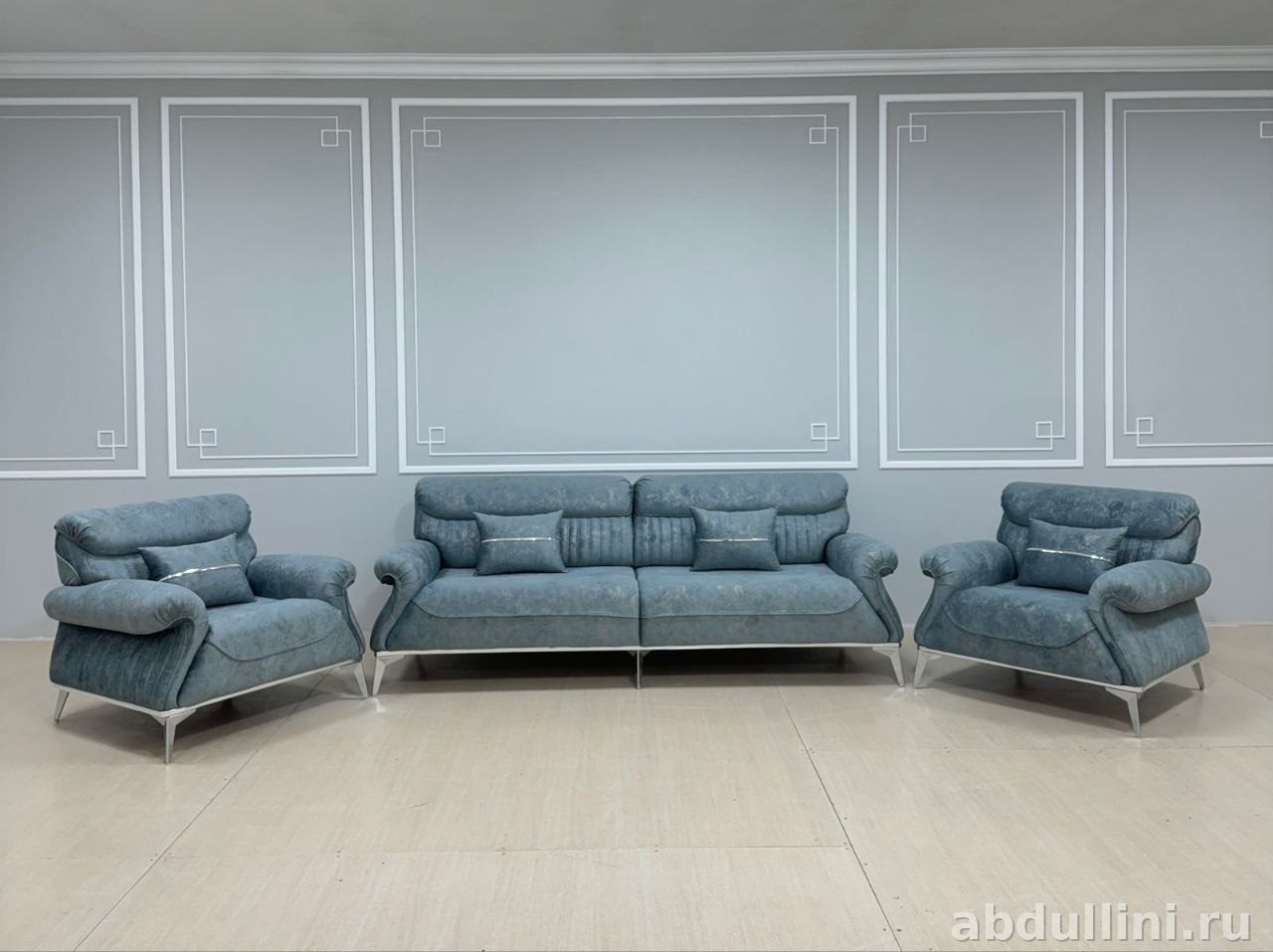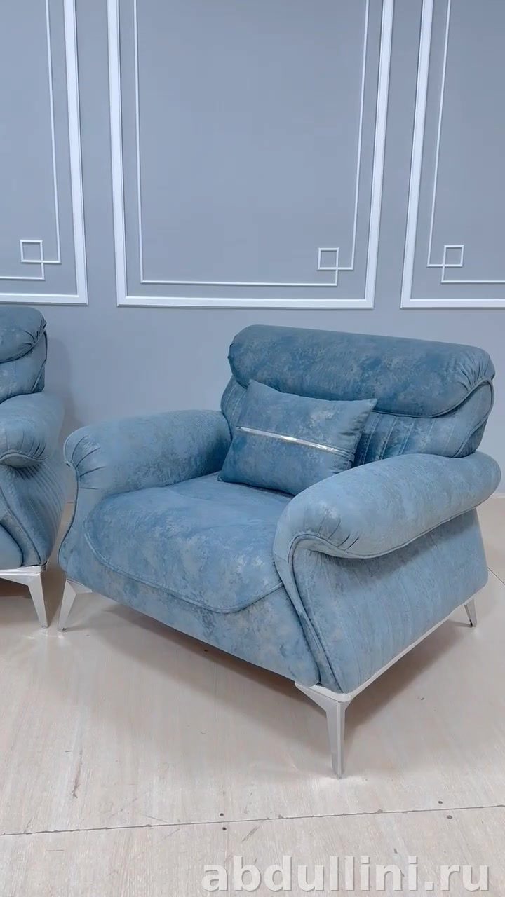 Цвет мебели — приглушенный голубой, напоминающий морскую волну. Обивка выполнена из мягкой ткани с эффектом велюра, что придает мебели тёплый вид. Декоративные серебристые полосы на подушках и спинках подчеркивают стиль и добавляют визуальный интерес.
