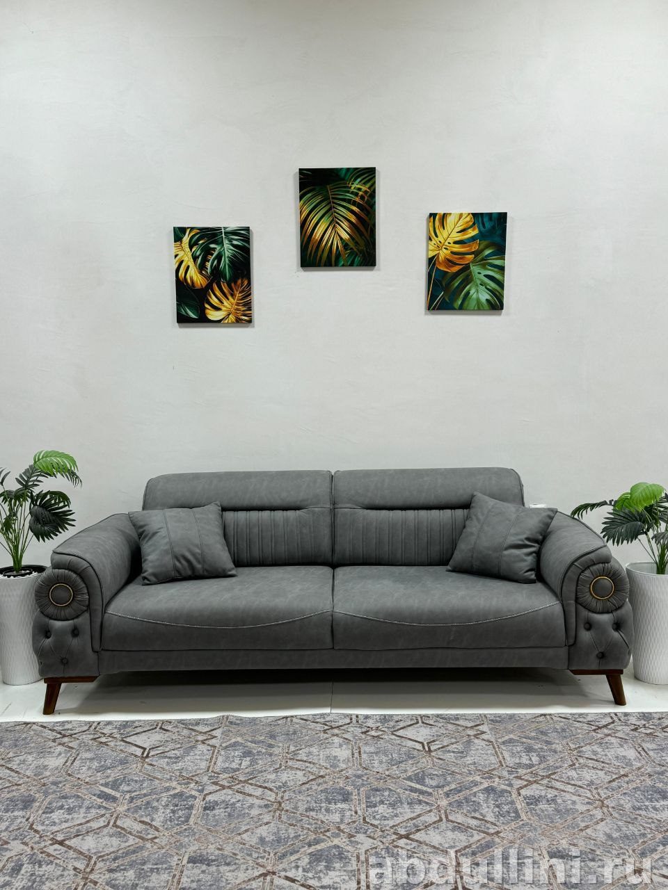 Комплект мягкой мебели Oscar включает диван и два кресла. Диван трехместный, с мягкими подушками для комфорта, подлокотники украшены декоративными элементами и пуговицами в технике капитоне. Кресла с высокой спинкой и подлокотниками дополняют комплект. Обивка выполнена в приглушенном сером цвете с дымчатым оттенком, матовая, без глянца.