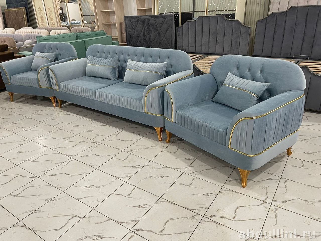 Обивка — небесно-голубая, матовая с велюровым эффектом, приятная на ощупь. Декоративная золотистая окантовка подчёркивает изысканность дизайна. Подушки в тон обивки с аккуратной прострочкой добавляют завершённости.