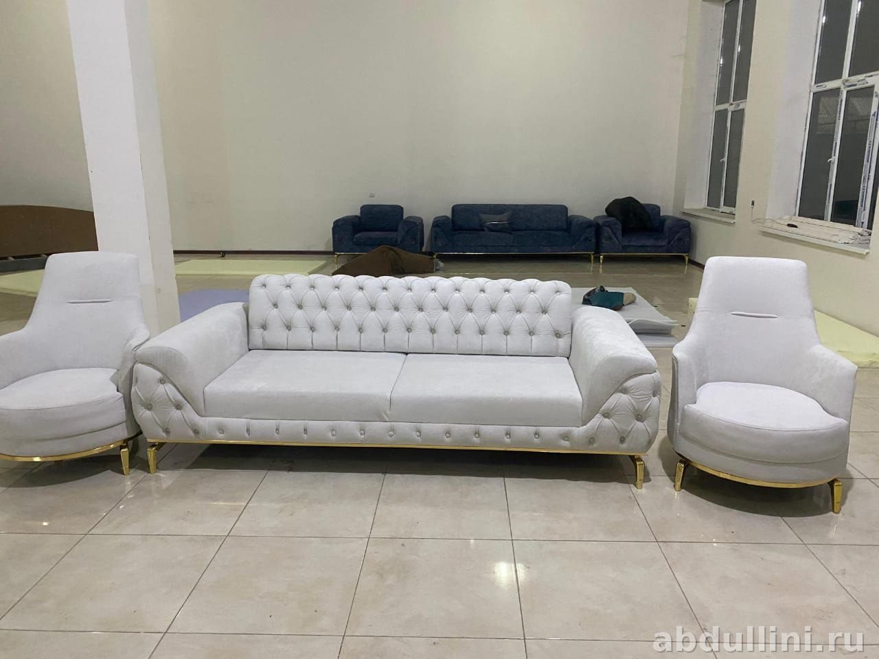 Диван трехместный, с откидной спинкой и декоративной стяжкой «капитоне» на спинке и боковых частях. Подушки сиденья и декоративные подушки с золотистыми вставками дополняют общий дизайн. Кресла с высокой спинкой и мягкой обивкой создают удобство и гармонируют с диваном.