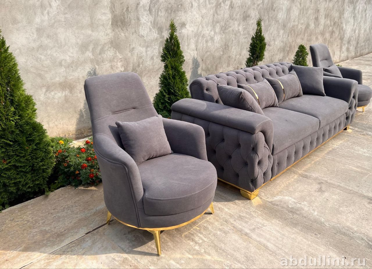 Комплект мягкой мебели Stella включает диван и два кресла. Основной цвет обивки – приглушенный серый, близкий к графитовому, матовый, без глянца. Диван украшен декоративной стяжкой «капитоне» на боковых частях и спинке, что добавляет ему элегантности. В комплект входят семь подушек: две серые квадратные по краям, две прямоугольные с золотистыми полосками посередине и три для кресел.