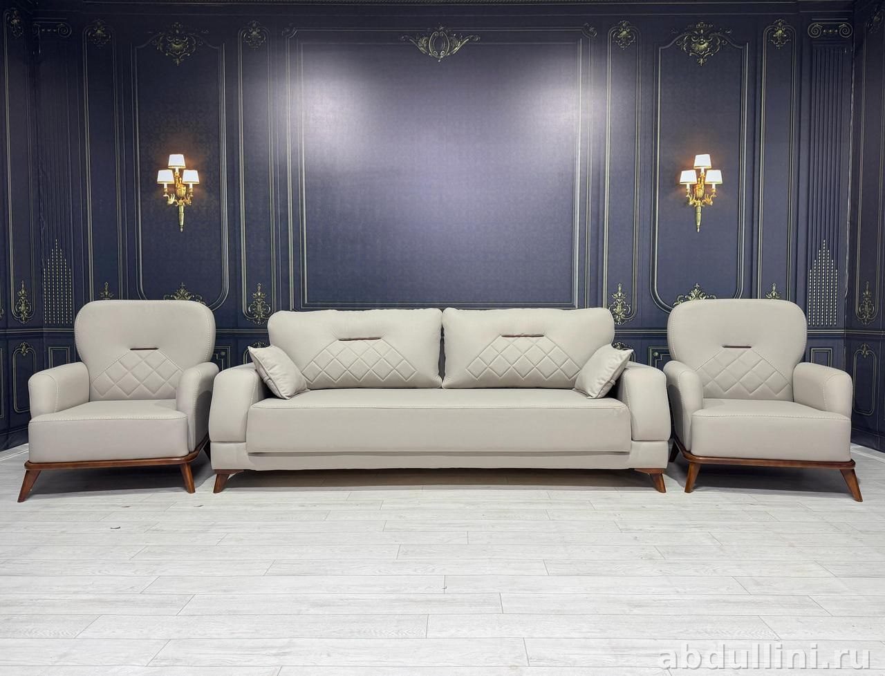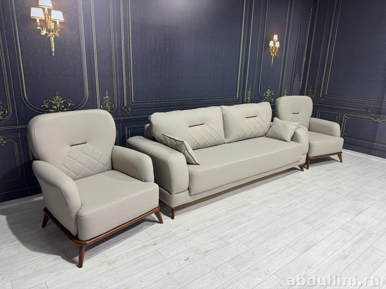 Комплект мягкой мебели «Венеция» включает диван и два кресла. Дизайн выполнен в стиле неоклассика с элементами современного дизайна. Светло-серая матовая обивка с ромбовидной прострочкой создает сдержанный и стильный вид. Ножки из дерева теплого коричневого оттенка дополняют общий стиль.
