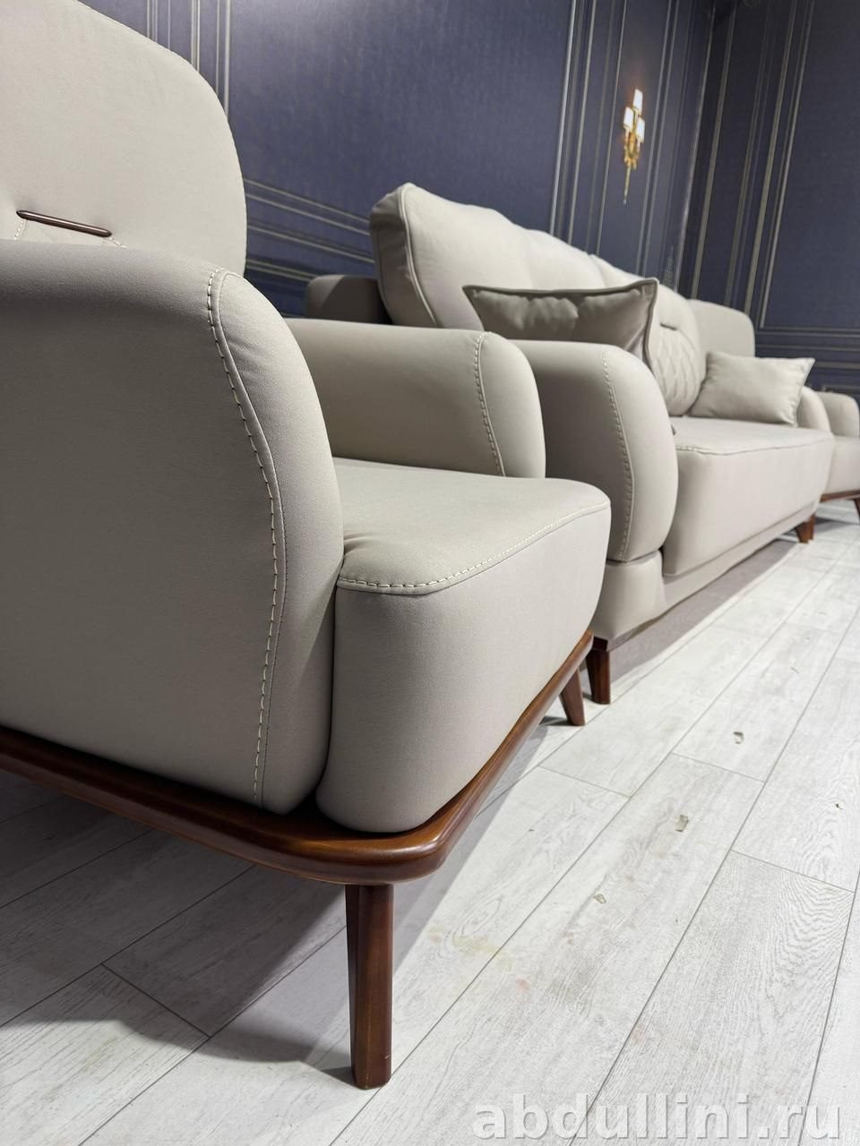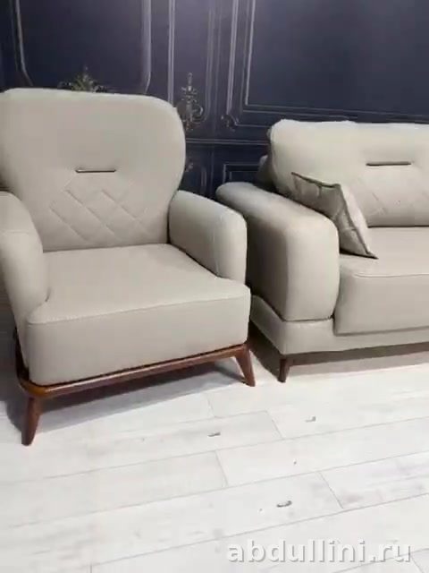 Мебель подходит для гостиных, залов и других помещений. Светлый оттенок обивки легко вписывается в интерьер, а практичные материалы обеспечивают долговечность.