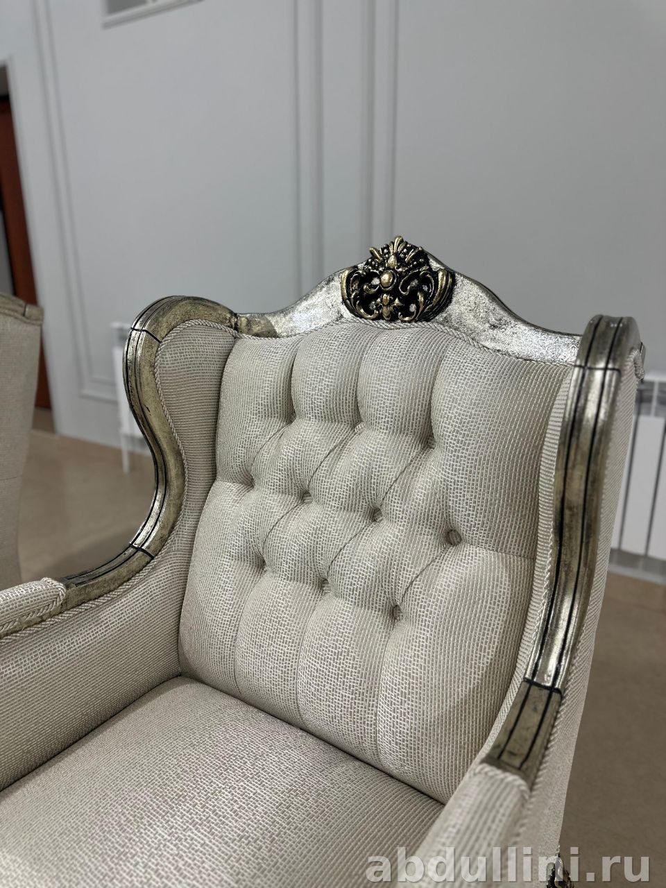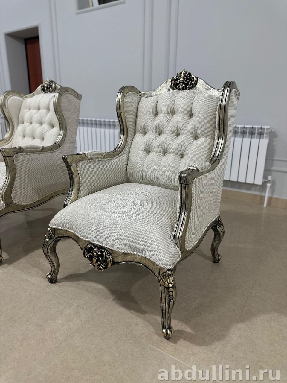 - Конструкция: диван с декоративной стяжкой на спинке, мягкие подлокотники, резные ножки. Кресла с высокой спинкой и каретной стяжкой.