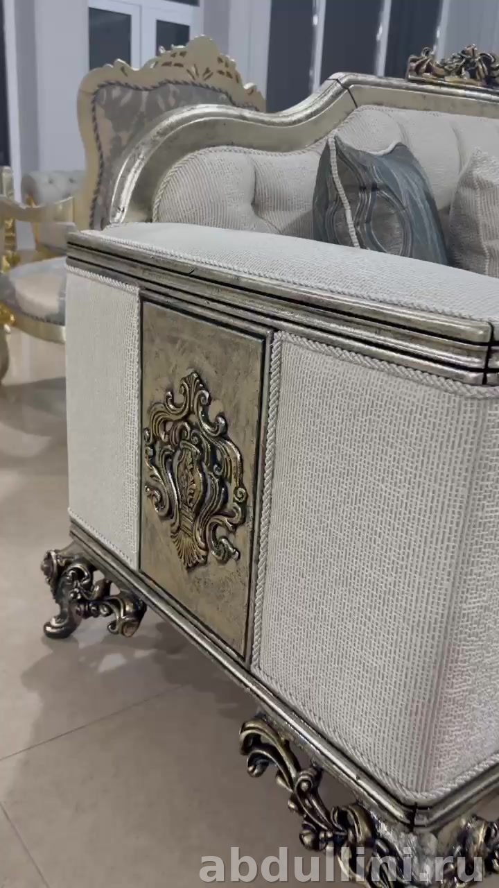 Комплект мягкой мебели ZUMRA 2042 — новое поступление из Турции. Включает двухместный диван, два кресла и журнальный стол. Цвет обивки — светло-бежевый с серебристым мерцанием, текстура ткани выраженная. Каркас выполнен в серебристом цвете с эффектом состаренного серебра, декоративные элементы дополнены золотистыми акцентами.