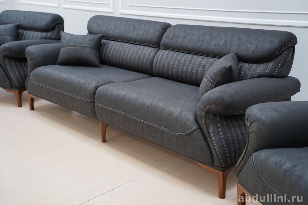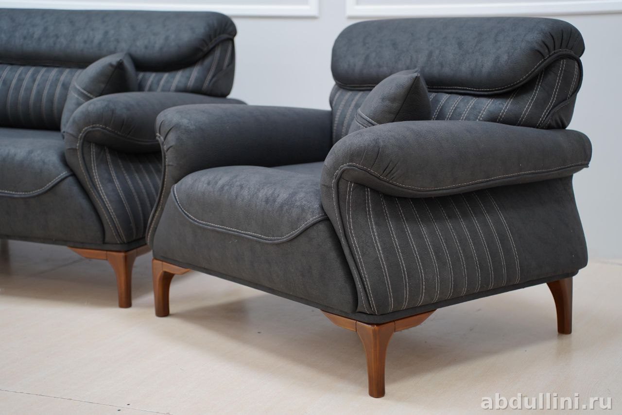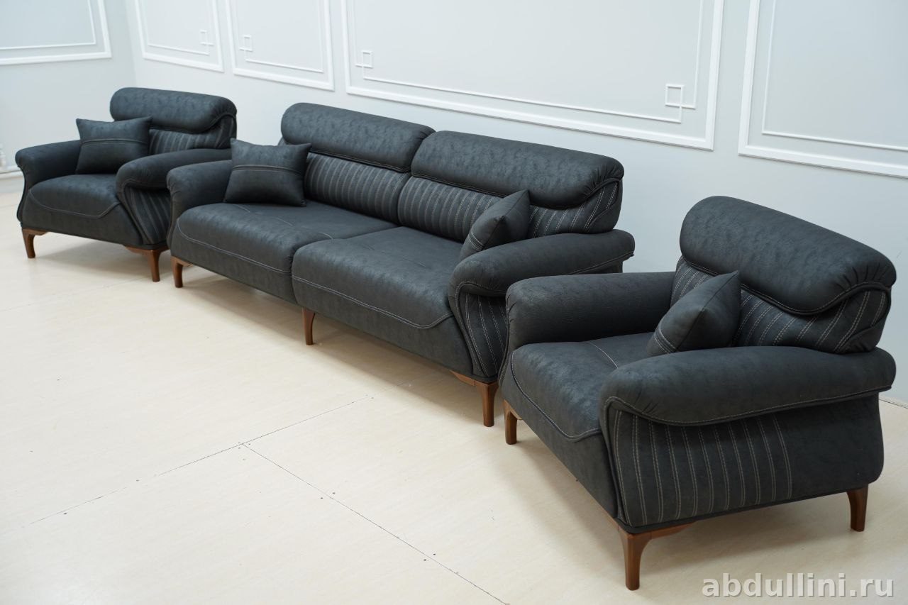 Комплект из дивана и двух кресел в современном стиле с элементами минимализма. Подойдет для гостиной или зала. Цвет — насыщенный темно-серый, почти черный, с легкой текстурой, добавляющей глубину оттенку. Обивка выполнена из прочной мебельной ткани, возможно, имитирующей кожу или замшу. Каркас — дерево или фанера, ножки деревянные, лакированные.