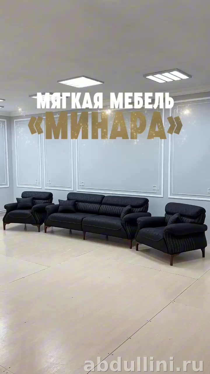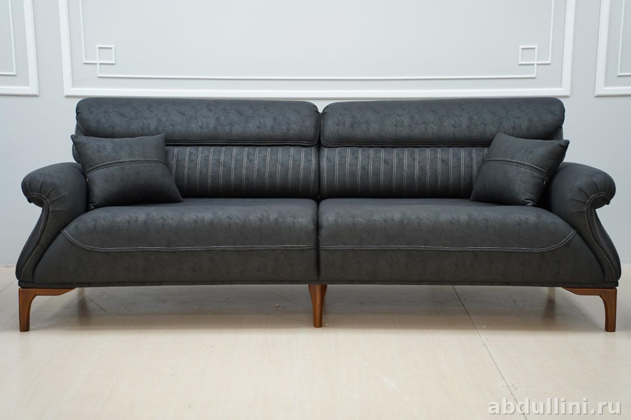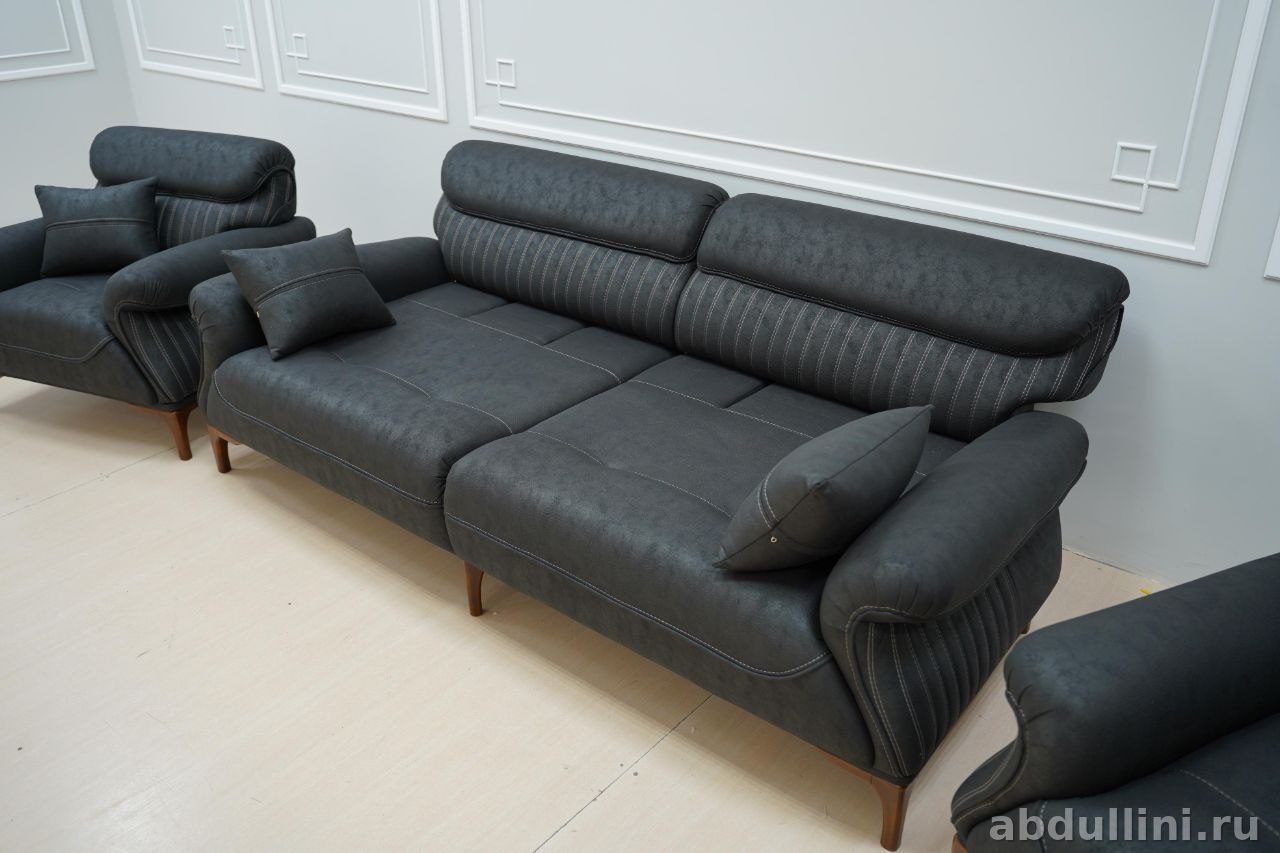 Комплект из дивана и двух кресел в современном стиле с элементами минимализма. Подойдет для гостиной или зала. Цвет — насыщенный темно-серый, почти черный, с легкой текстурой, добавляющей глубину оттенку. Обивка выполнена из прочной мебельной ткани, возможно, имитирующей кожу или замшу. Каркас — дерево или фанера, ножки деревянные, лакированные.