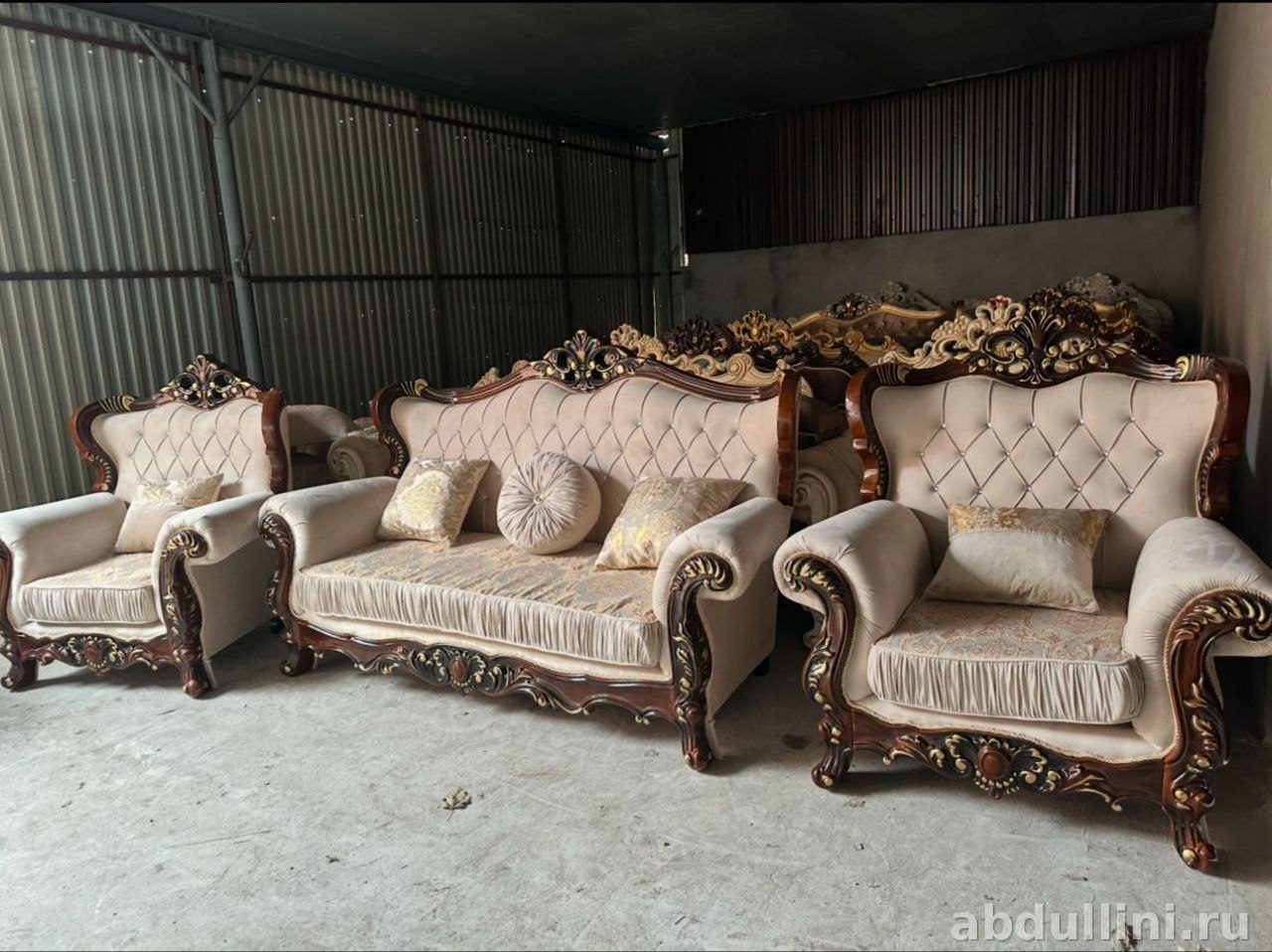 Комплект из дивана и двух кресел в классическом стиле с элементами барокко. Обивка — светло-бежевый текстиль с ромбовидной стяжкой, деревянные элементы с золотистой отделкой. Диван раскладной, три посадочных места.