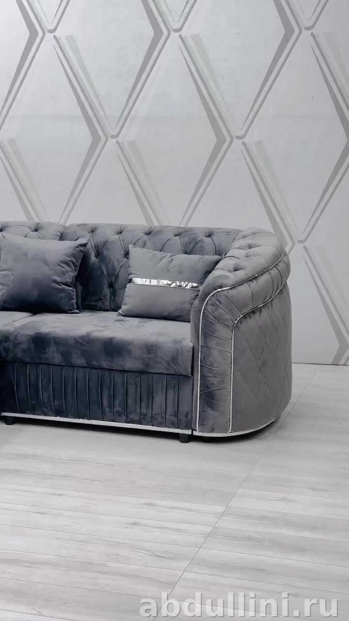Комплект мягкой мебели включает угловой диван и кресло. Обивка выполнена в двух оттенках серого: графитовый для кресла и угловых секций, нейтральный серый для центральной части дивана. Текстура матовая, вероятно, велюр или бархат. Декоративные элементы — каретная стяжка на спинках и подлокотниках, серебристая окантовка по периметру. Подушки в тон обивки с серебристыми полосками.