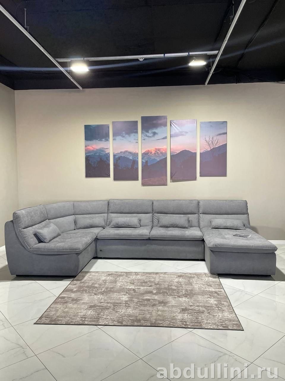 В комплекте: угловая секция, прямые секции, секция с механизмом трансформации и оттоманка с бельевым ящиком. Каркас — дерево, обивка — износостойкий текстиль.