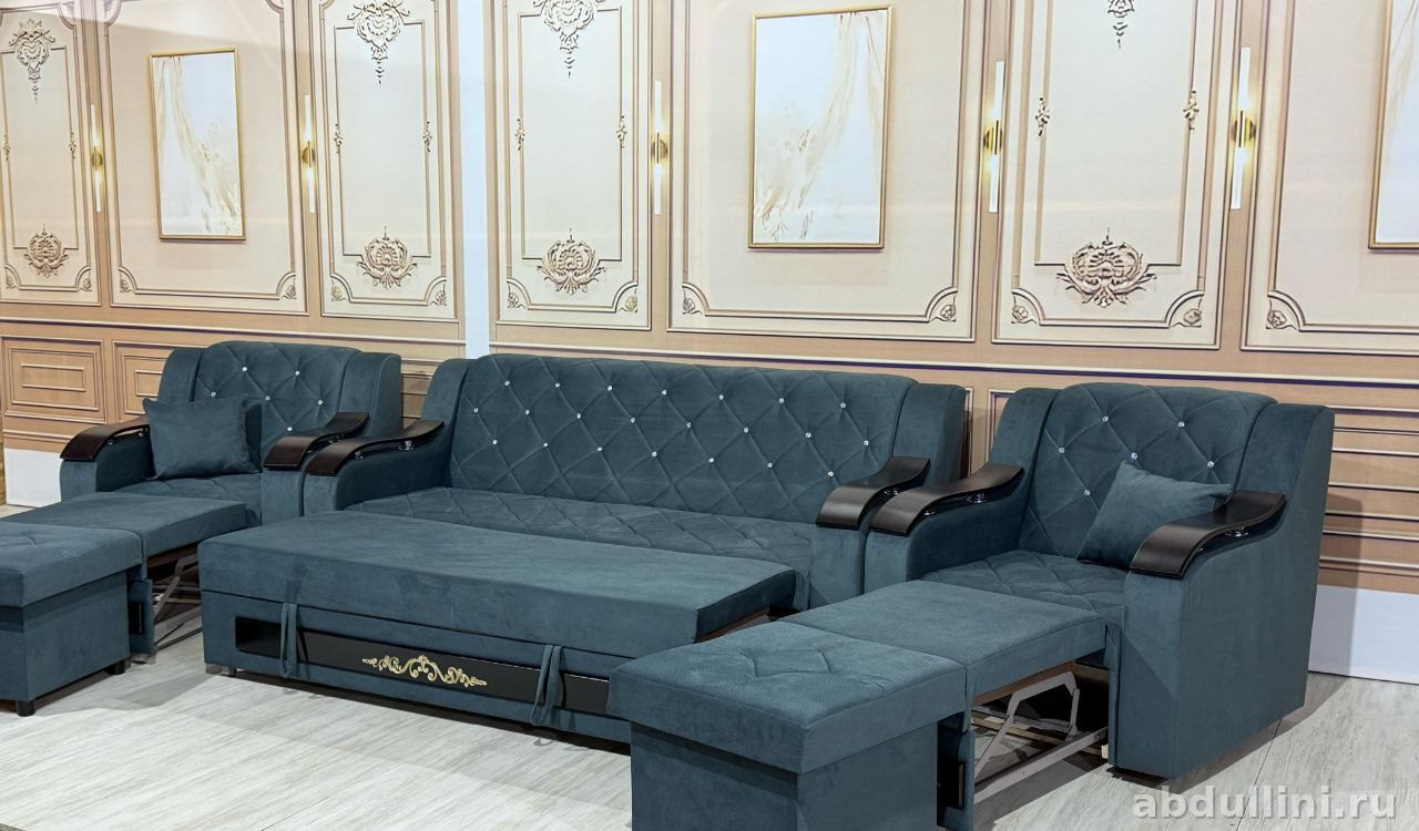- В комплекте: диван (раскладывается в спальное место 120/180 см), 2 кресла, 2 пуфа (один можно использовать как часть дивана)
