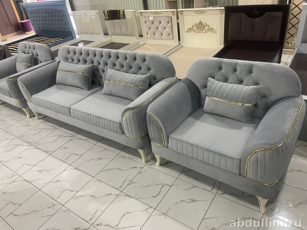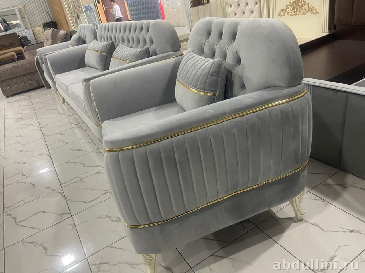 Комплект мебели Тройка Шайх — это стильное решение для вашего интерьера. В комплект входят трехместный диван и два кресла, выполненные в едином дизайне. Основной цвет обивки — светло-серый с серебристым оттенком, который дополнен золотистой декоративной полосой по контуру подлокотников, спинки и основания. Матовая текстура обивки добавляет элегантности, а капитоне (ромбовидная стяжка) на спинке и подушках подчеркивает классический стиль.