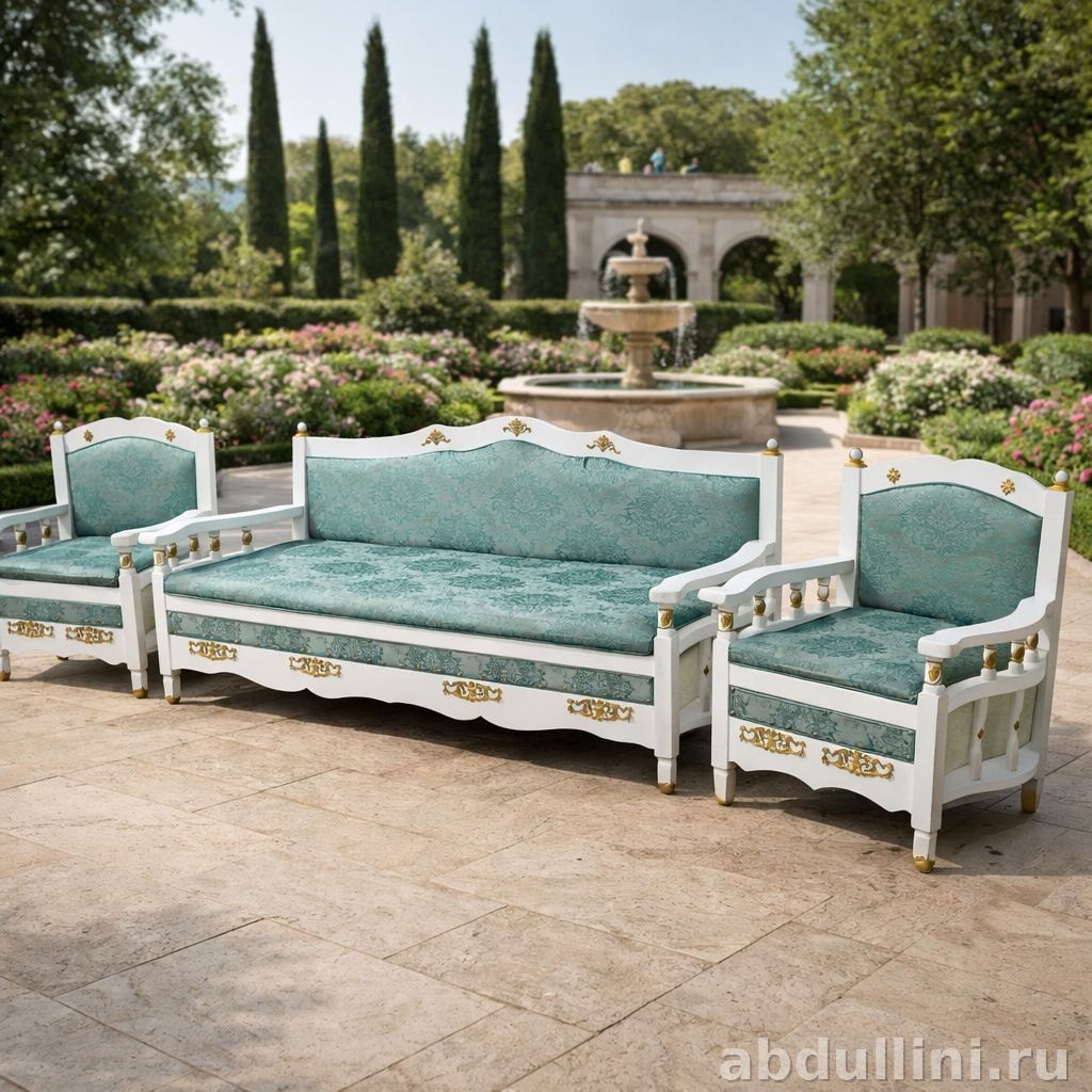Комплект из дивана и двух кресел в едином стиле. Каркас — белый матовый с золотистыми декоративными накладками, обивка — бирюзовый текстиль с растительным узором. Мебель собрана в классическом стиле с элементами неоклассики: плавные линии, высокая спинка, мягкие сиденья.