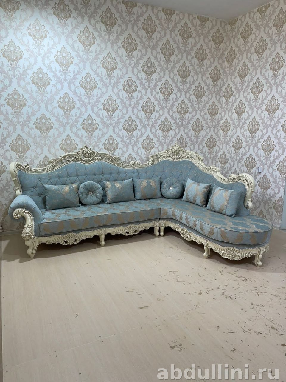 Диван 1859 — это угловой гарнитур в классическом стиле с элементами барокко. Его особенности — плавные линии, резной декор и изогнутая спинка. В комплект входят две секции и декоративные подушки разных размеров.