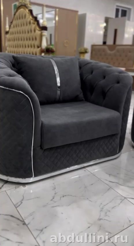 Комплект выполнен в сером цвете с матовой обивкой из ткани, напоминающей велюр. Декоративная ромбовидная прострочка (капитоне) добавляет изысканности. По контуру дивана и кресла проходит тонкая полоса, имитирующая металл. Подушки украшены вертикальными полосами из того же материала.