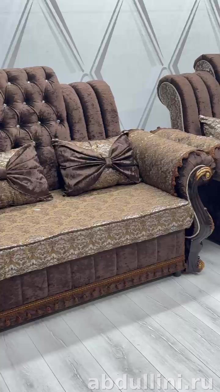 Конструкция углового дивана состоит из нескольких секций с высокой спинкой и ромбовидной стяжкой. Подлокотники мягкие, с резными элементами из дерева и золотистой патиной. В комплекте идут декоративные подушки прямоугольной формы. Двухместный диван повторяет дизайн углового, но меньшего размера, с подушками в форме банта. Пуф круглый, обтянут той же тканью, с кантом и кисточками.