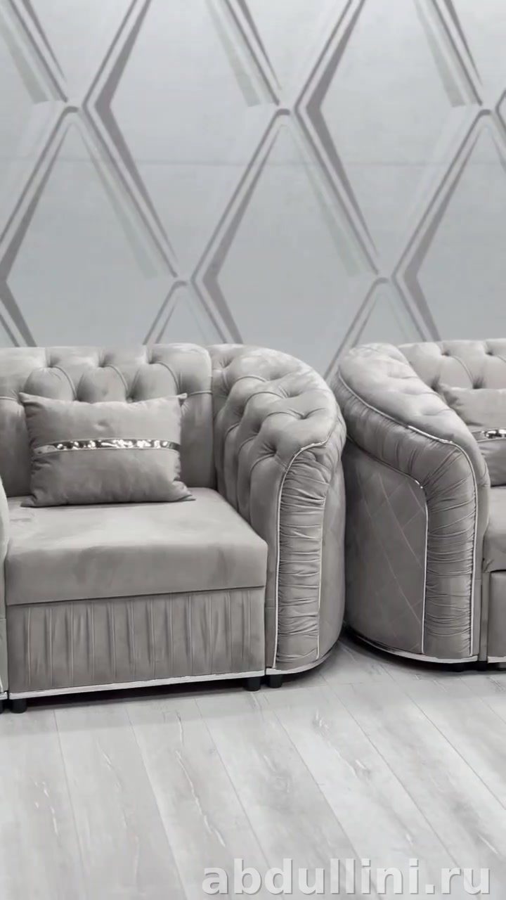 Комплект мягкой мебели 3387 включает угловой диван и кресло. Обивка выполнена в светло-сером, почти бежевом оттенке, с матовой бархатистой текстурой. Каретная стяжка на спинках и боковинах добавляет мебели изысканности, а серебристая окантовка подчеркивает контуры.